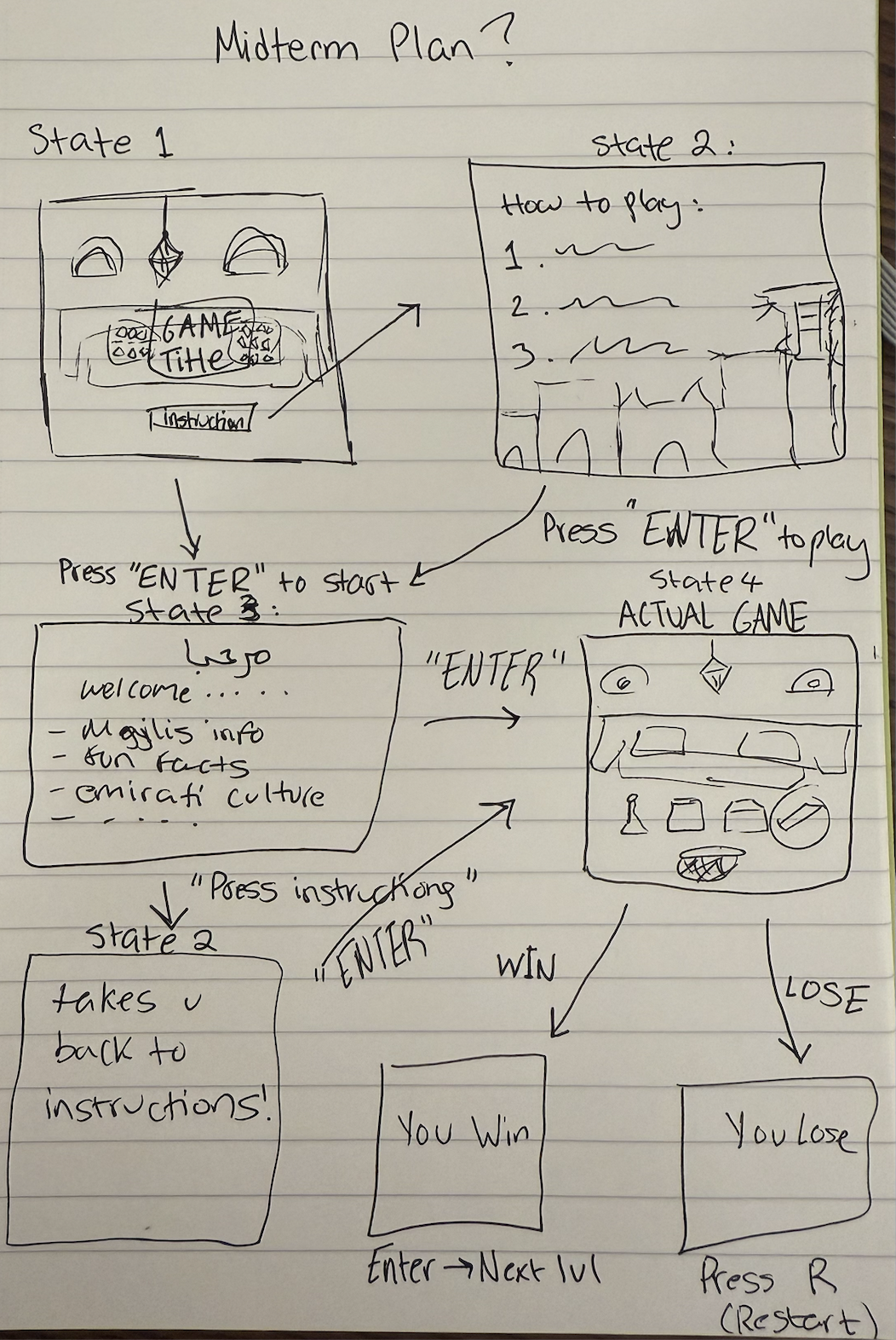 Before I wrote a single line of code, I began designing the game on paper. Sketching out screens and flows helped me plan the user experience in a structured way. I connected this process with UI concepts we had learned in class, like keeping instructions simple, providing clear feedback, and creating intuitive navigation between states. Having this roadmap made the actual coding process smoother, since I already had a clear vision of how each part of the game should look and feel.