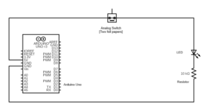 For my project, I created an Arduino switch that activates through physical contact, specifically, a hug. Instead of using hands, I built a simple “hug switch” using two pieces of aluminum foil connected to the Arduino. One piece was taped onto my sleeve, and the other onto a plush toy sitting on my chair. When I hugged the toy, the foil pieces touched and completed the circuit, turning on an LED on the breadboard.