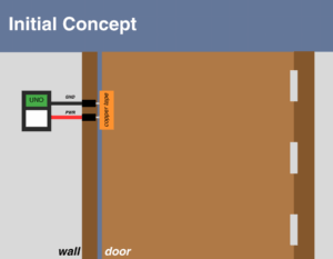 Sometimes I don’t fully close my door properly and don’t know if it’s fully closed. That inspired me to make the door a switch to act like a DIY security system. I have no experience with physical computing so I had some trouble visualizing how it would look in my head, and it didn’t help that I’ve been out sick for so long. This image below was my initial concept for it.