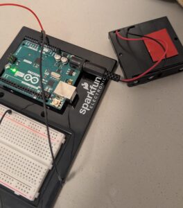 One of the challenges was having a mobile power source, as I was definitely not going to use my laptop for power when the Arduino kit is all the way up on the wall. I remembered that I found a battery pack in the kit so I dug that out and went down to the IM lab to ask for help and got some spare AA batteries.