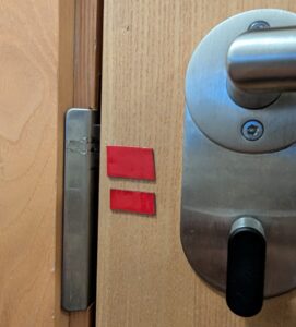 I was pretty perplexed by this. After some critical thinking, I realized that I could set up the arduino on the door itself. And not only that– I could even take advantage of this metal piece that helps the door slide into the lock near the door handle. This was my updated plan for my switch: