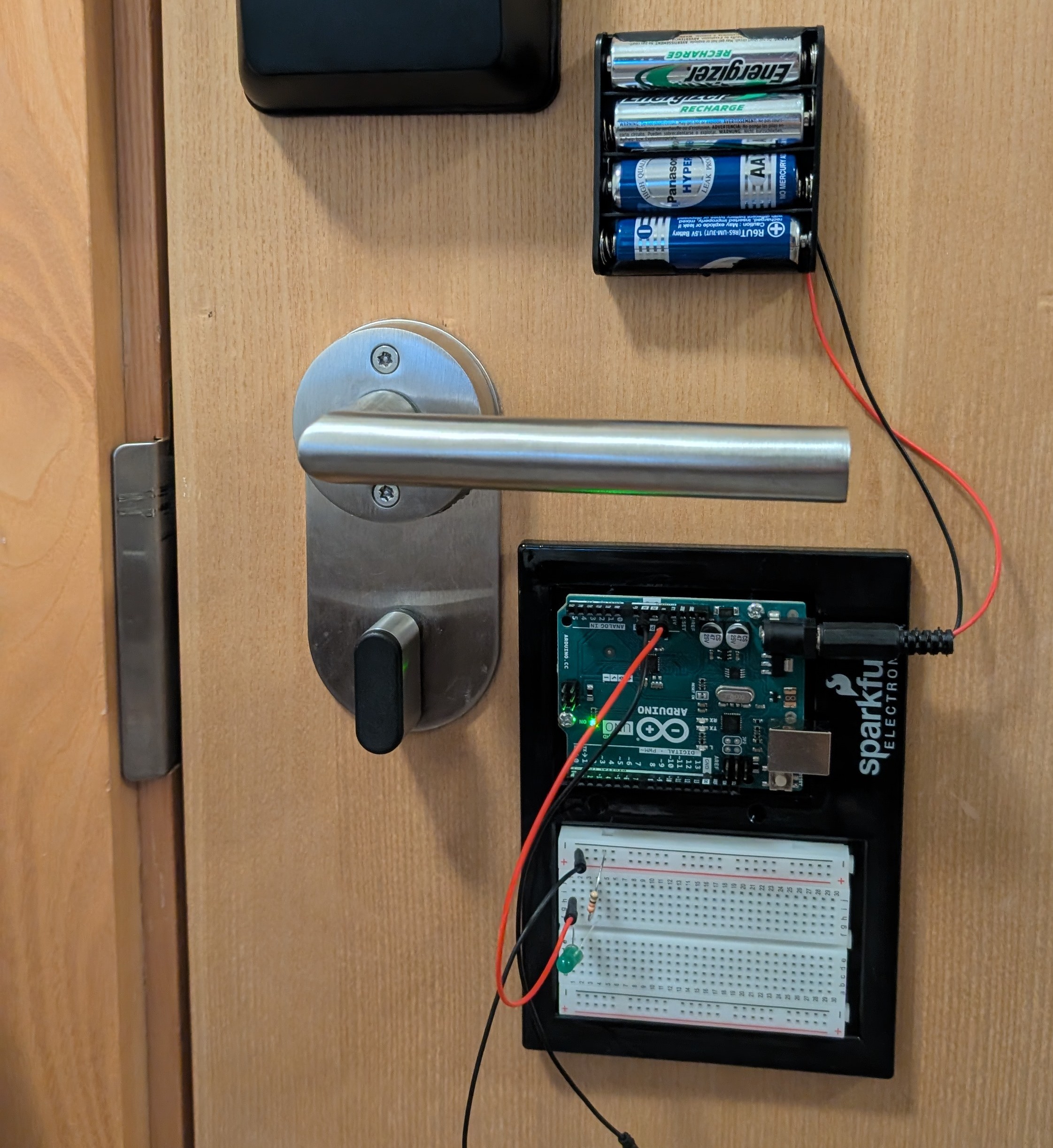 Here’s a video of the final result in action; the green LED lights up to indicate a full lock when closed properly. I would not recommend installing this as your sole security system.