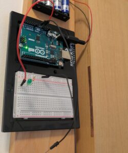 I walked over to my door and applied some copper tape and set up my Arduino & battery pack on the wall using some mounting tape. However, as I worked on setting up the rest of the copper tape, I realized that this was going to very clunky– the door’s frame is not seamless with the door itself which means I need something solid to connect it; however, the copper tape was a bit too flimsy to be that connection. This is what I had so far at the time: