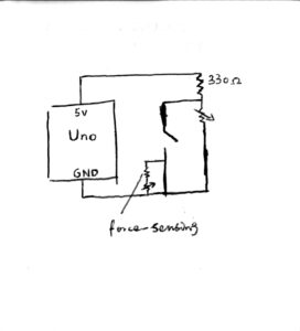 LOW). - “Active” State: While the button is held, a FSR (force-sensing resistor) is pressed, which controls the brightness of a green LED (my analog output).