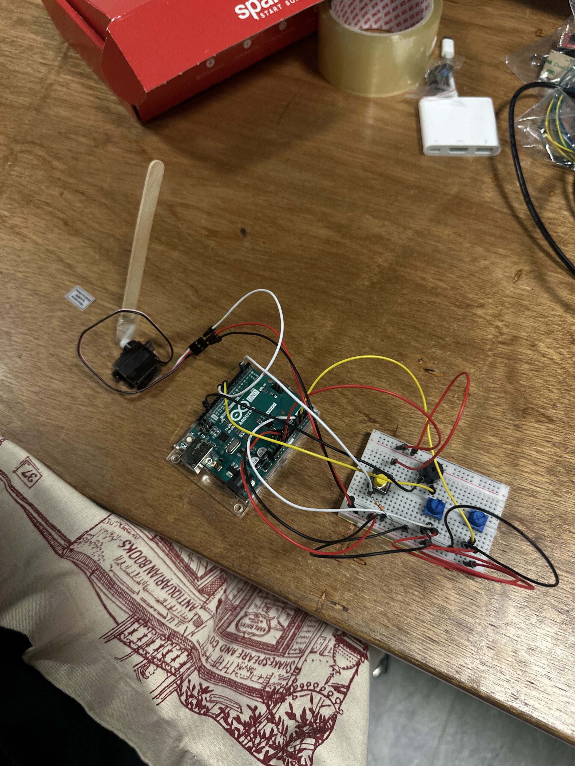 In terms of reflections, we struggled a lot to make the base work because we needed to attach the wooden stick to the servo and it was not stable at all at first. The way we attached it was by using tape, which was the primary cause of why it was unstable. As a result, every time we ran the servo fast, the stick fell off or the servo stopped working for some reason. We eventually managed to make the stick and servo stable by placing some weight on top of the setup so that no matter how fast the servo moved, the stick remained stable.