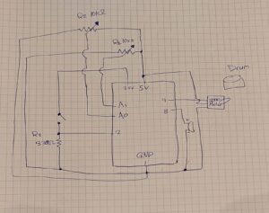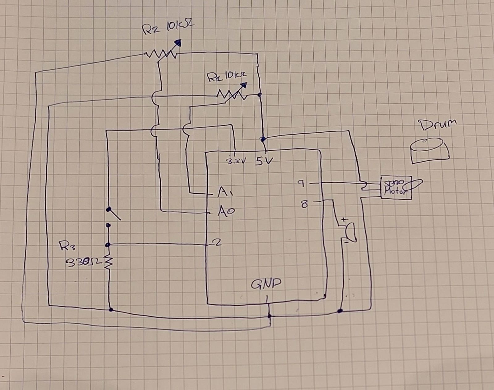 The main concept for our group project is a DJ, since we wanted to experience what it feels like to be one. A DJ needs to handle many sounds and instruments using their unique artistic skills to create music that makes people happy and excited. Thus, we crafted this device called “NYUAD DJ Kit.” By using it, you can choose different kinds of songs with various speeds and a base sound produced by a wooden stick. This is a unique way to compose new kinds of songs as a DJ.