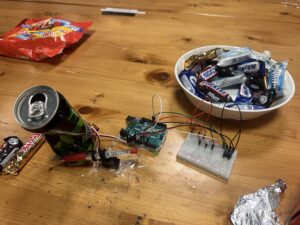 From this idea, the Diet Drum emerged — a device that reacts whenever someone reaches for a snack. The system is both humorous and relatable, externalizing the human struggle of self-control. When a hand approaches the snack bowl, a servo-powered drumstick strikes, accompanied by a short melody from a passive buzzer. The result is a playful, judgmental interaction that transforms a familiar, internal tension into an amusing and performative experience.