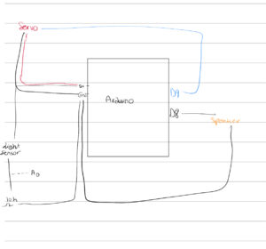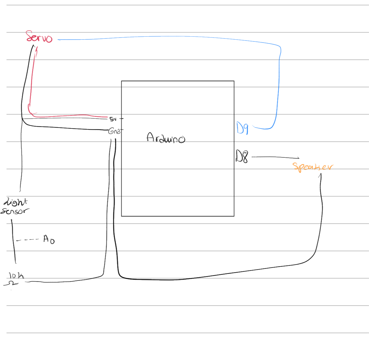 When the LDR senses that a hand has blocked the light, the Arduino makes the servo play the melody and hit the drum. This creates a clear, immediate connection between what a person does and how the system responds, showing ideas from our readings about how devices can react to gestures and sensor input.
