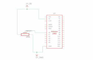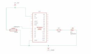 We made the ball bounce continuously up and down in p5.js, and connected an LED on the Arduino that lights up briefly every time the ball hits the floor. A potentiometer on the Arduino was used to control the horizontal movement of the ball: turning the knob to higher values moves the ball to the right, and lower values move it to the left. The potentiometer’s outer pins were connected to 5V and GND, and the middle pin to A0. Using Web Serial, we read the potentiometer values in p5 and mapped them to the horizontal position of the ball while it keeps bouncing.