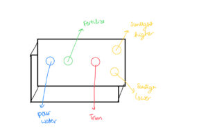 The final project idea I have in mind is to make a connection between the Arduino and p5.js to take care of plants. Through buttons the user can fill the meter for water (through a blue buttons), then add fertilizer (yellow button), to trim (red button), to move sunlight closeness(yellow buttons one for arrow up one for arrow down).