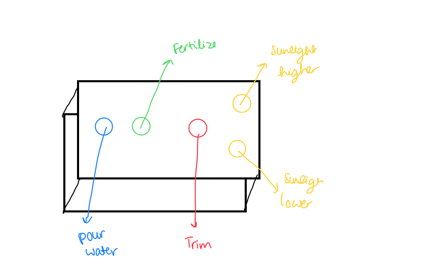 You can even get a score or a rating based on how well you took care of the plant. Checking each metric. The Arduino part would be multiple buttons and a box that covers these buttons with larger buttons on the wooden box (design is inspired by the beat hoven project displayed in class).