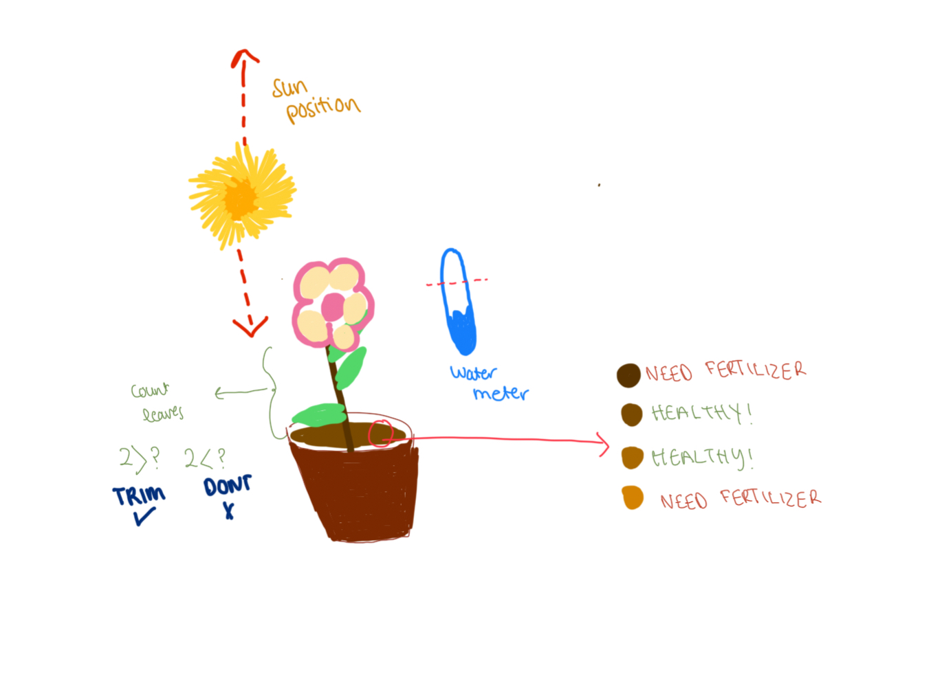 The final project idea I have in mind is to make a connection between the Arduino and p5.js to take care of plants. Through buttons the user can fill the meter for water (through a blue buttons), then add fertilizer (yellow button), to trim (red button), to move sunlight closeness(yellow buttons one for arrow up one for arrow down).