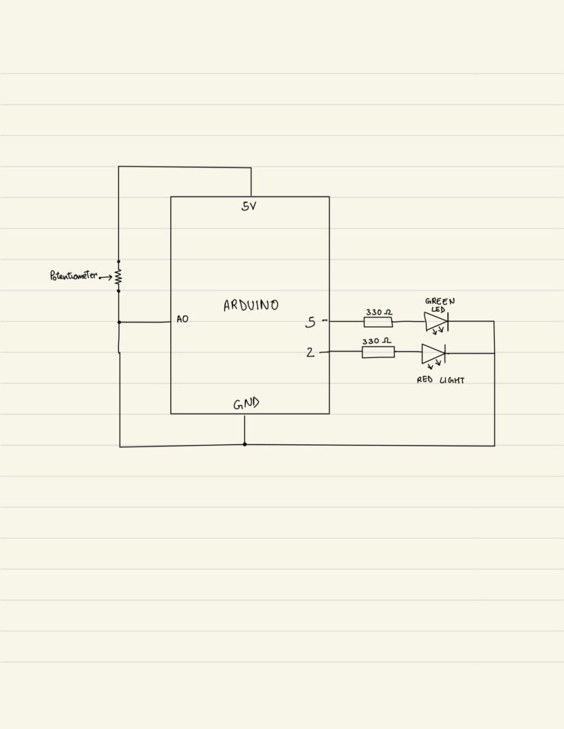 The Arduino handles three primary responsibilities within the system. First, it continuously reads the analog input from the potentiometer and sends the corresponding values to the p5.js sketch, ensuring smooth and accurate control of the rotation mechanic. Second, it receives beat indicators from p5.js sent as a boolean (either a 0 or 1). It uses these signals to toggle between the red and green LEDs, creating a synchronized lighting effect that reacts to the music. Finally, it maintains a consistent serial handshake with p5.js, ensuring stable, real-time communication between the physical hardware and the digital interface.