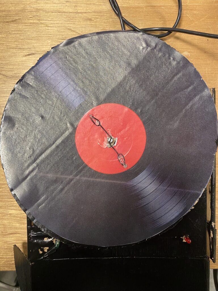 Another challenge involved the physical setup, specifically, securely attaching the potentiometer to the wheel so that its rotation accurately corresponded to what happened on-screen. Initially, the potentiometer would slip and the wheel would rotate independently of the potentiometer, resulting in no characters moving. I experimented with several mounting methods, including tape, cardboard supports, and temporary adhesives, but none provided the stability needed. Eventually, I created a more secure mechanical design and connection using wires to attach potentiometer to the wheel. This ensured the wheel turned the potentiometer directly and consistently. Once this was fixed, the rotation displayed in p5.js finally matched the physical motion of the disc, creating a reliable control mechanism.