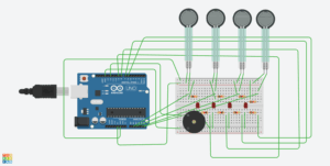 The arduino code controls the four force sensors, dividing their input into 4 categories each of which corresponding to a specific speed. It sends over to the p5 the values of the sensors along with the state of the toggle button. It also has 4 LEDs that it controls depending on the signal from the p5.js, to signal which artwork is currently being explored by the user and a buzzer to signal the opening and closing of a work. Further in parallel with the works in p5, one of the works plays a melody on the buzzer while the other controls the flashing on an LED.