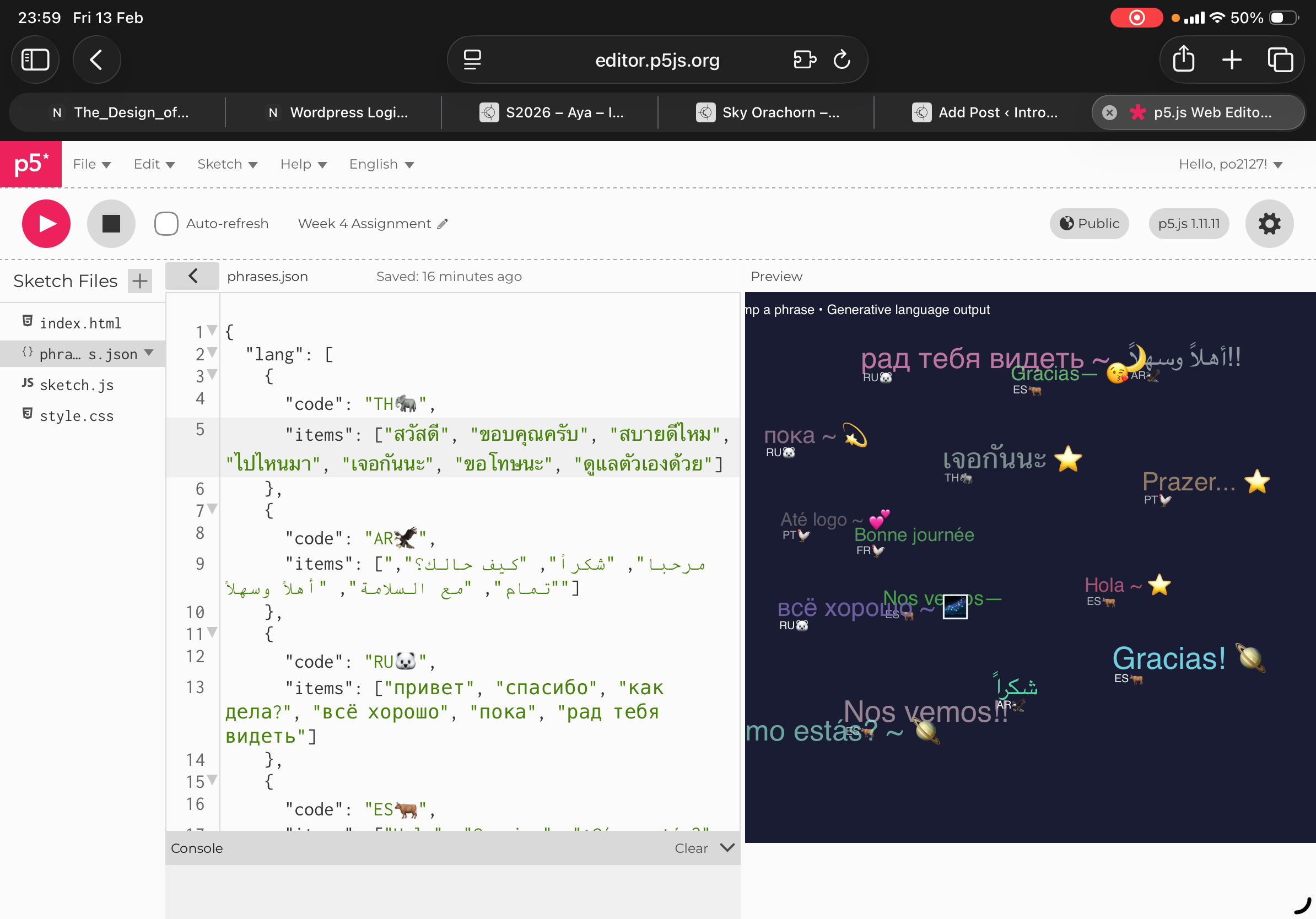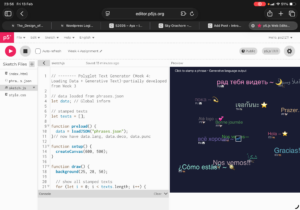 For the concept of my work, I based on what I partially developed from week 3 where last time I did a bubble generative text from the mouth drag, and how after dragging the mouse after the output would make lots of bubbles react, thus this time I did greetings and simple phrases from each of the languages that I speak. From watching the video tutorial 1.4 on JSON Data I was able to break it into 3 sections language, punctuation, decoration where for each greeting or word language I set a random variable deco where output randomly decides to go along with language, punctuation and decoration respectively. Once again ranking all of the arrays within the square brackets.