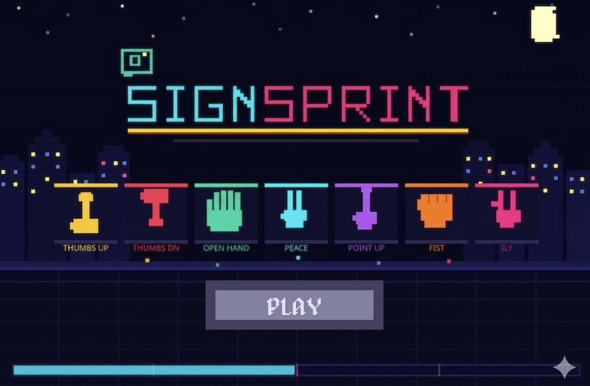 SignSprint is a game based on computer vision that recognizes 7 different hand gestures which are Thumbs up, Thumbs down, Victory, Pointing Up, Victory, Closed Fist, I love you and Open Palm. The game works on a gesture recognition machine learning model by Google AI for Developers through MediaPipe Studio. The model can be tried out here.