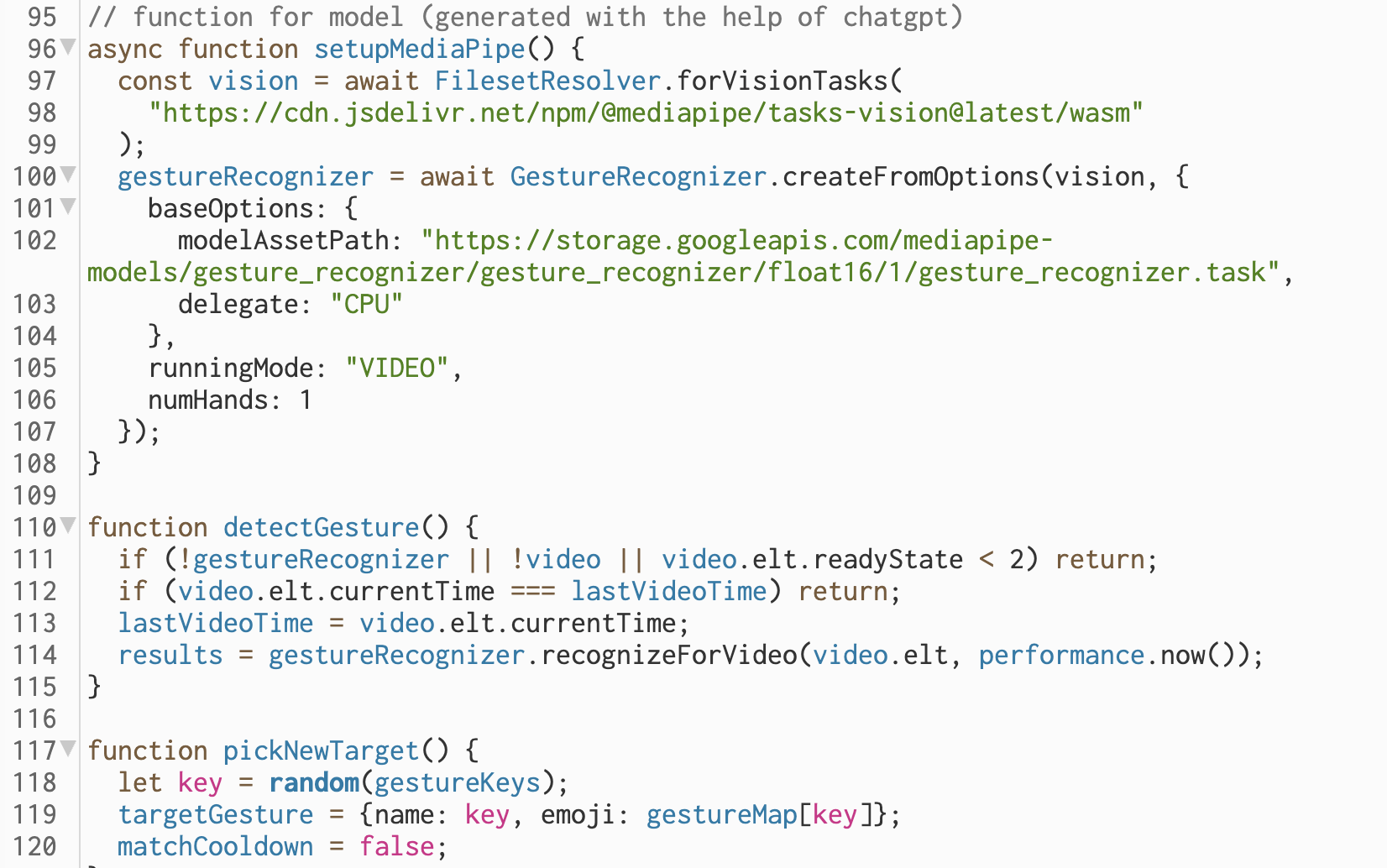 The game mainly runs on the the hand gesture machine learning model which was stated above. The biggest challenge in making this game was importing the gesture recognition model in p5js. I used cluade AI to help in this process. With the help of AI, I was able to modify the html file and create functions in order to import the right model into the p5js file which enables us to run the game. Claude AI was also used in the making of the setupMediaPipe and detectGesture() function to enable the game run the scoring system.