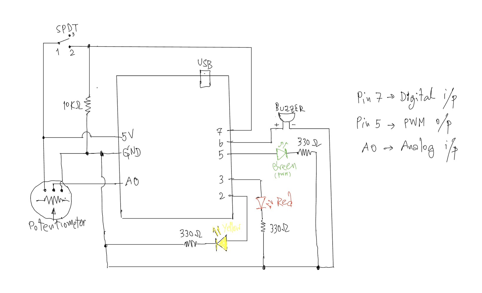This project explores the use of both analog and digital inputs in Arduino by combining a potentiometer and a switch to control multiple outputs in a meaningful way. The goal was to clearly demonstrate the difference between discrete digital control (on/off) and analog control (gradual change) through LEDs and a buzzer.