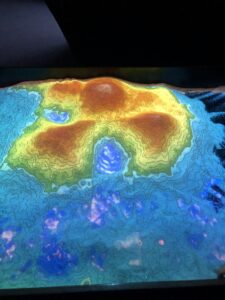 The projected image on the sand changes based on the height of the sand in a certain area. For instance, if you create a mini sand hill, the projected image on that hill will be an island. In areas with less sand, they will show as surrounding sea water. The design changes as you change the sand. This got me thinking about its implementation. I predict it probably uses sensors from the top, which measure the distance between the sand and the sensor, to determine what should be displayed at that point. If the distance is shorter, then it shows the top of the island, and as the distance gets longer, it displays a transition from the top of the island into the ocean.