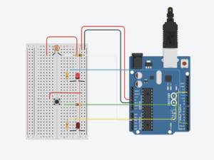Here is an image of my Arduino setup. I have my 5-volt wire connected to the + bus and my ground connected to the – bus. I also have the photoresistor and pushbutton connected to 5 volts, with their 10kΩ resistors connected to ground. Each LED is placed under its sensor, with one leg connected to ground and the other leg connected to a 330Ω resistor, which then connects to the assigned Arduino pin.