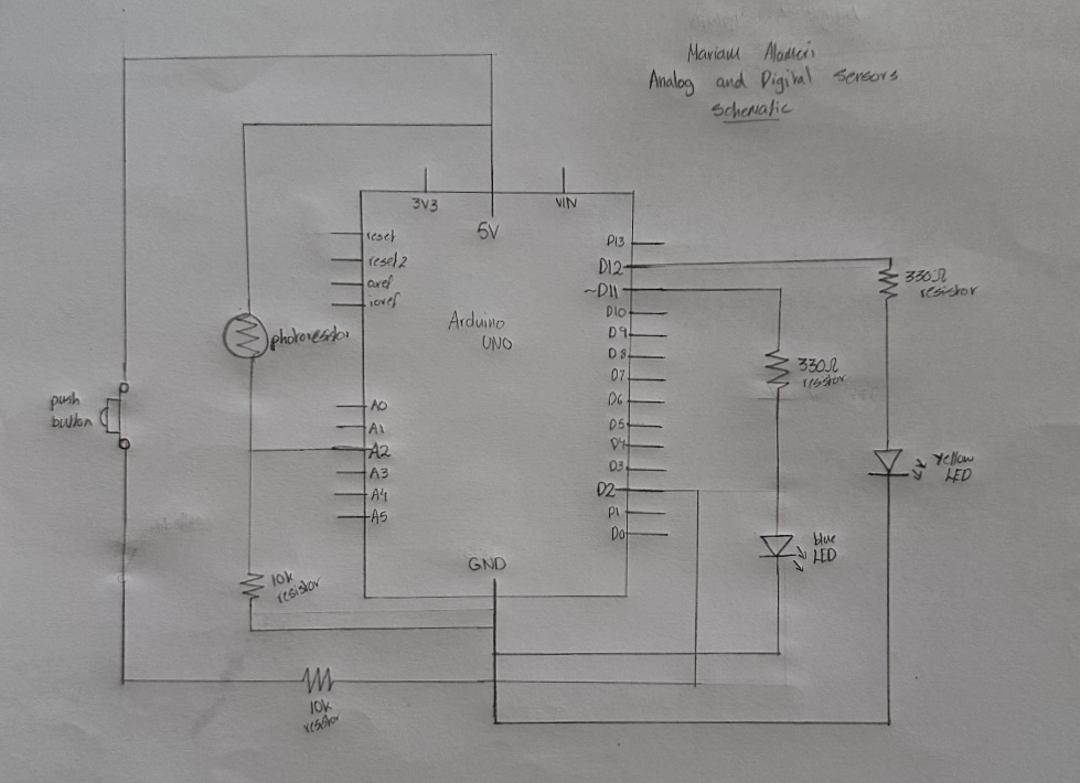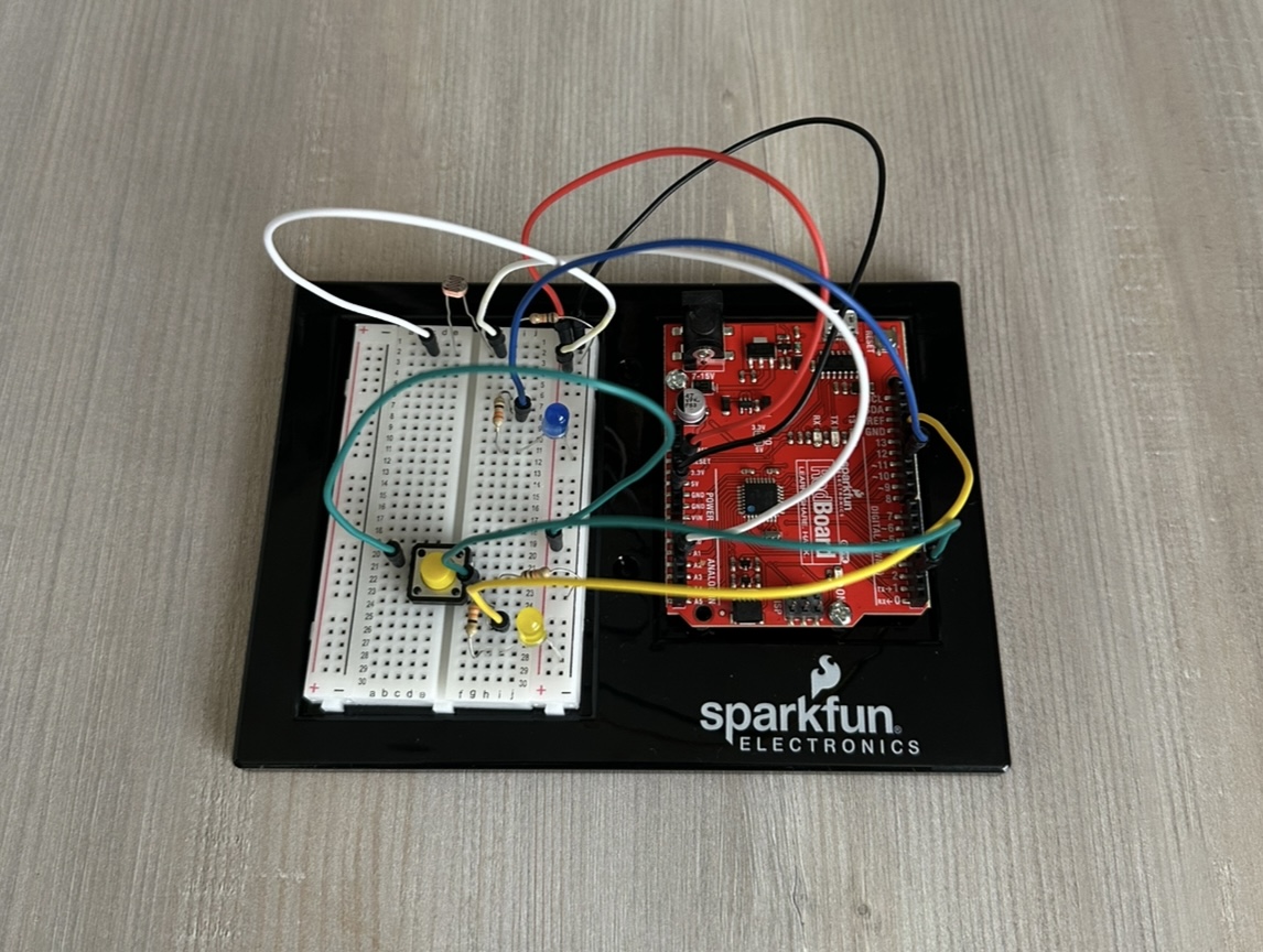 I created an analog system using a photoresistor, where a blue LED lights up in the dark when the surrounding lights are off, in a slow and calm fading manner. I also integrated a digital system using a pushbutton, where a yellow LED turns on and off when it is pressed. The blue light then slowly fades off again when the surrounding environment becomes bright.