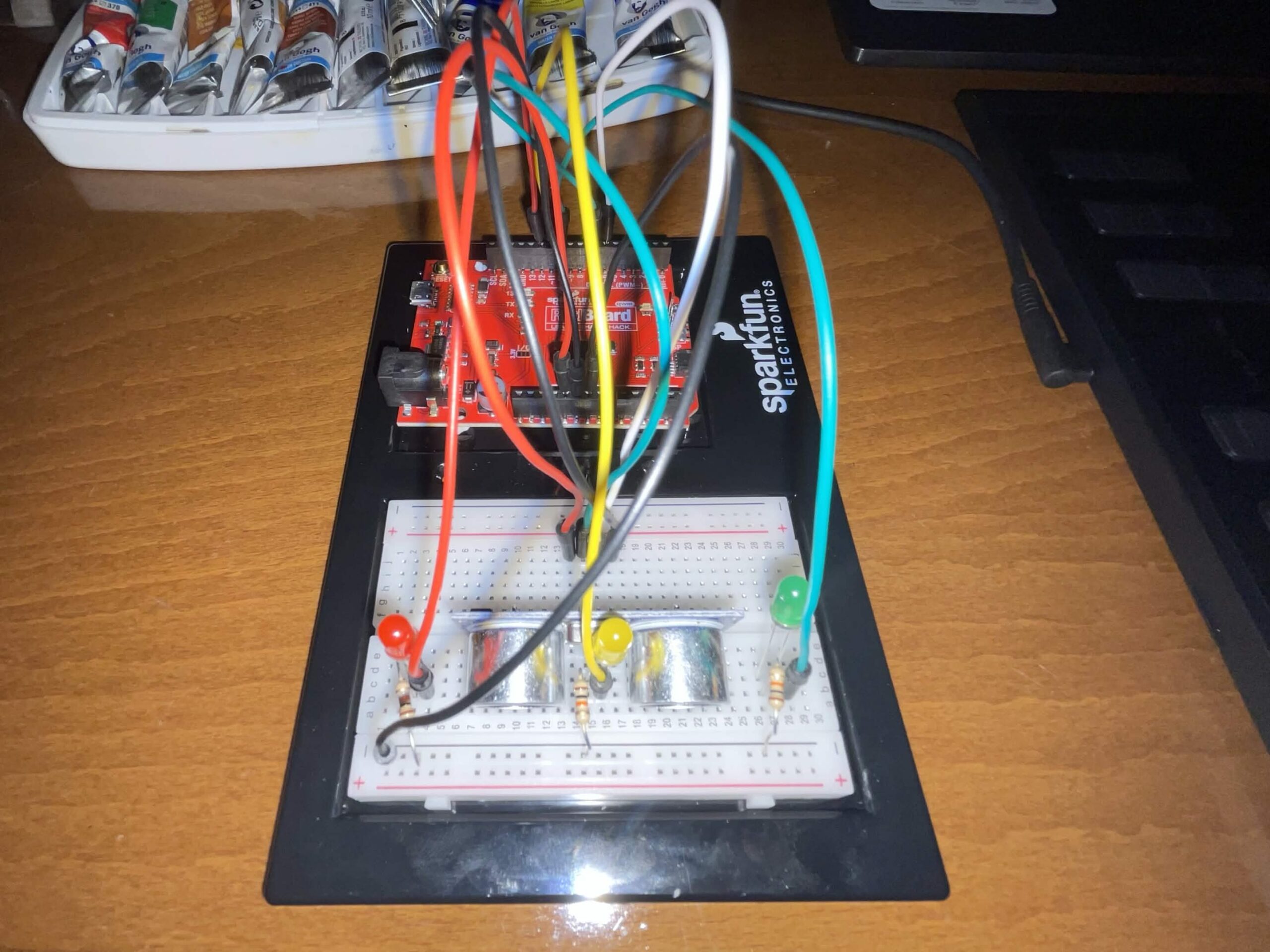 Using three LED lights and an Ultrasonic sensor, I made a little traffic light thing that goes from green to yellow to red the closer you get to it.