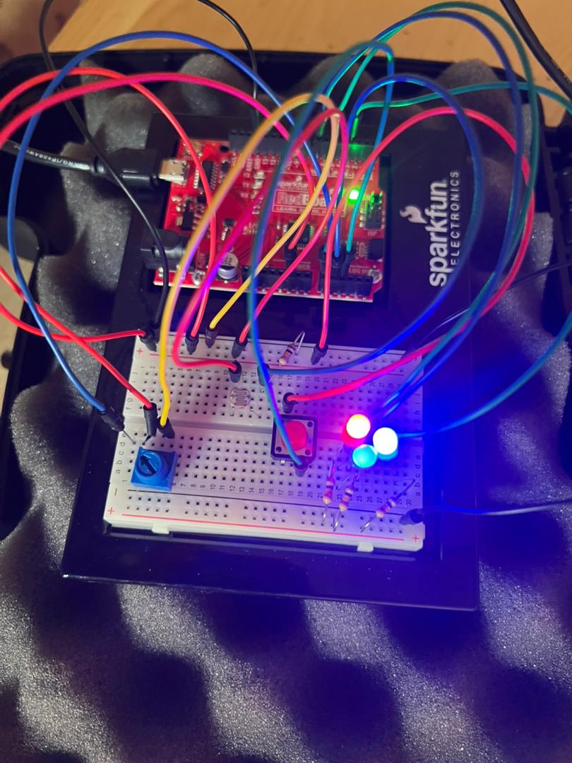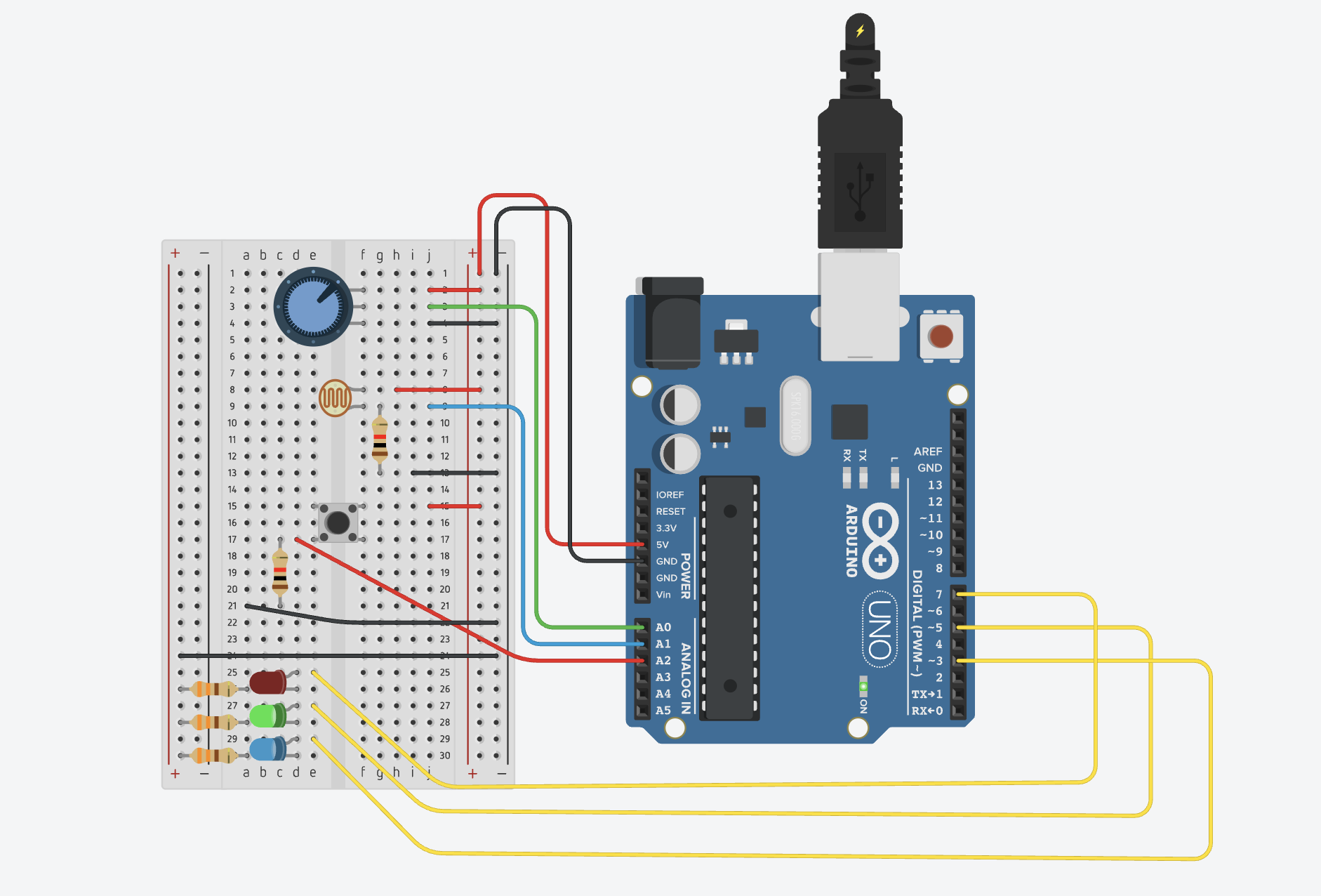 A photo-resistor, potentiometer and push switch are used to control the rgb values of the LEDs and the lights were physically merged together so as to give the idea they were producing one light of a specified color.