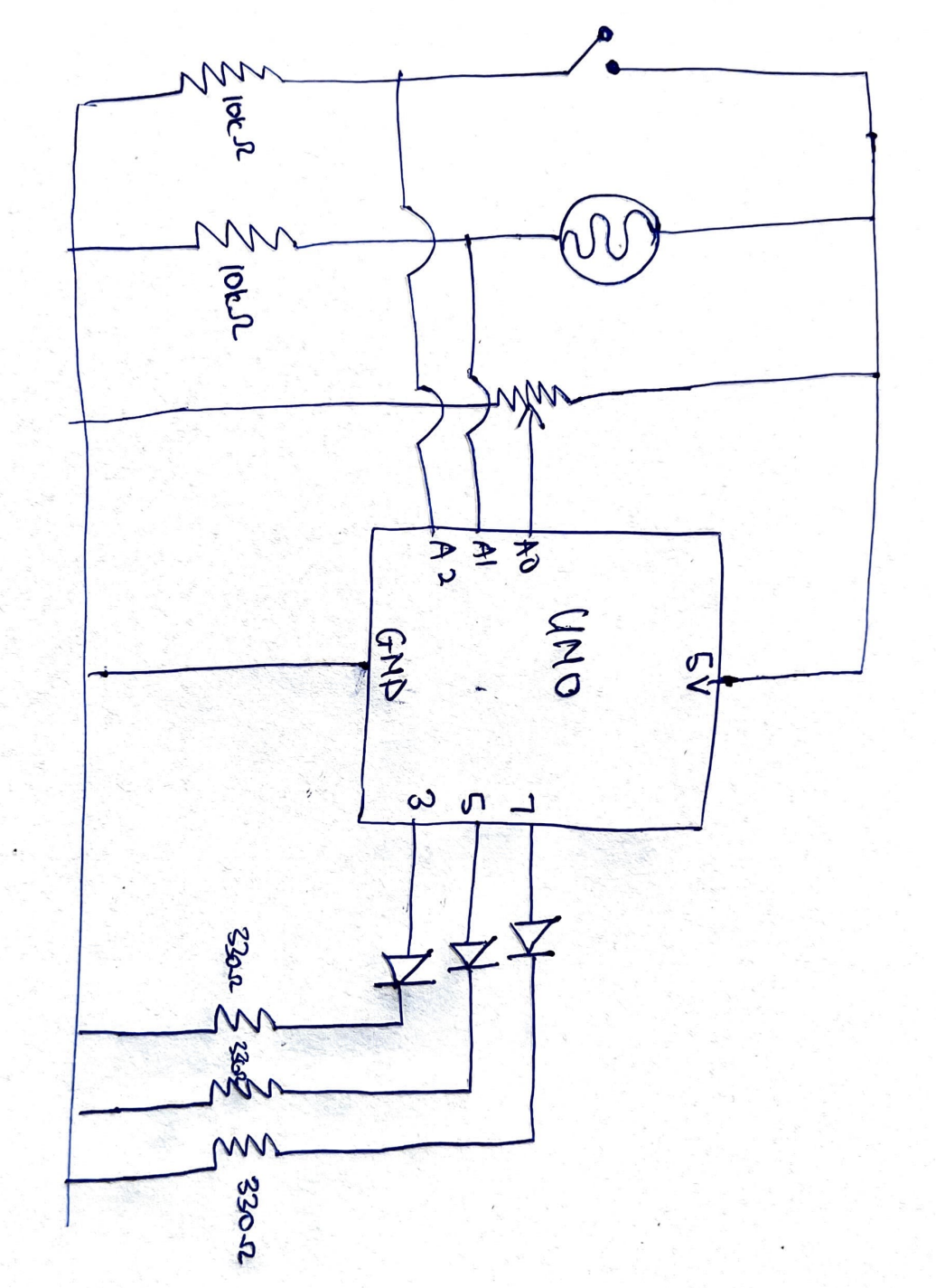 A potentiometer, photo resistor and a push switch were connected to 5V terminal. The analog input of each of these devices were read by the analog in pins A0, A1 and A2. LEDs were connected to pins 3, 5 and 7. The inputs from the potentiometer, photo resisters and push switches can be tuned to obtain the desired effect.
