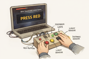 This project is a fast reaction game where the user controls a spacecraft without seeing the controls directly. The screen gives instructions like “press red, “flip switch,” or actions using Arduino sensors like “cover the light sensor” or”move closer.” The user has to read the command and quickly do the action on a physical console. It’s timed, so you need to react fast and accurately I might add more elements like once you get over 10 points youll have to start memorizing three tasks at the same time or have new rules added. If you’re right, the game continues, and if not, you lose. The idea is to make simple actions feel intense and engaging using both physical controls and sensor based interaction.