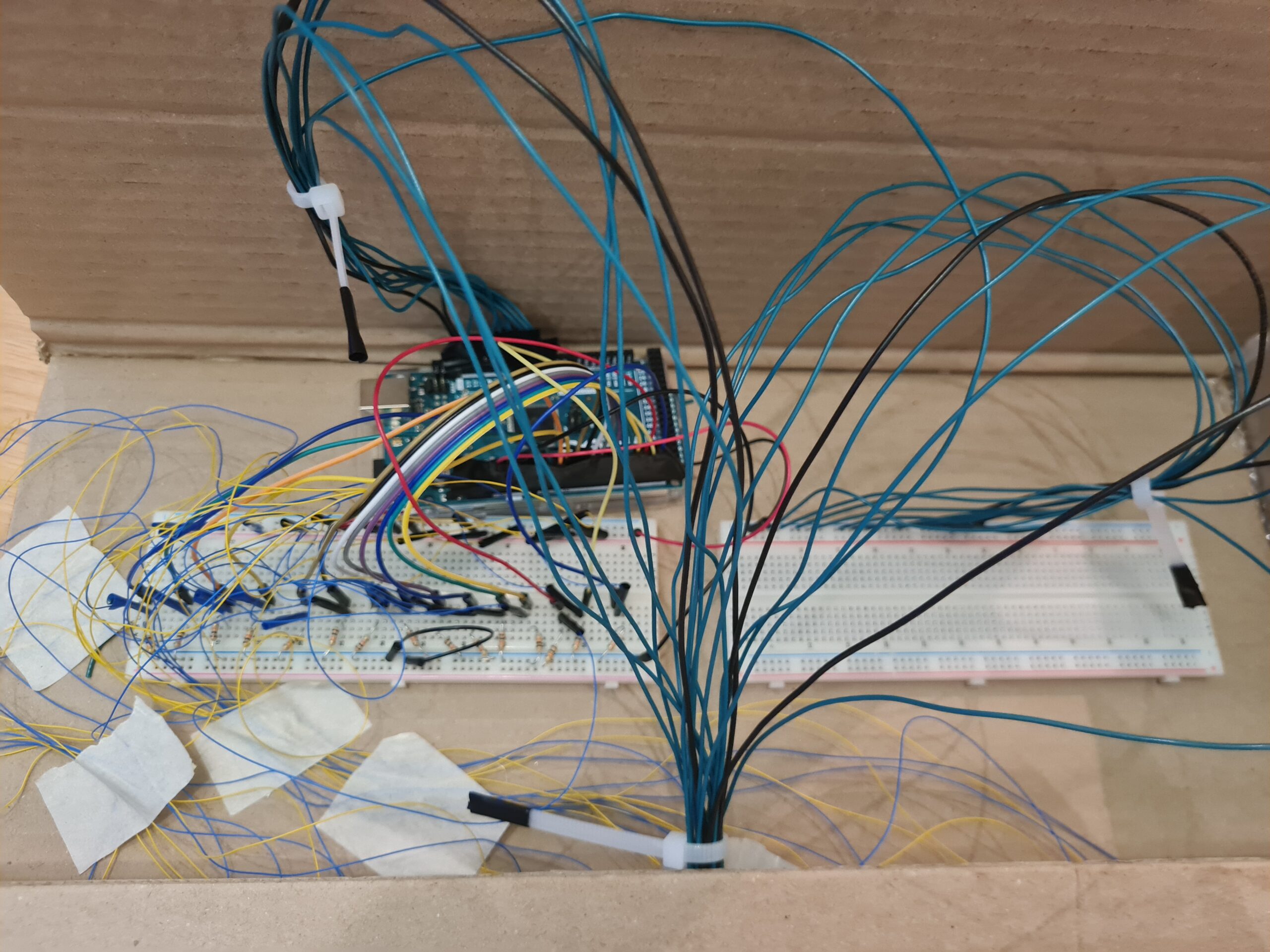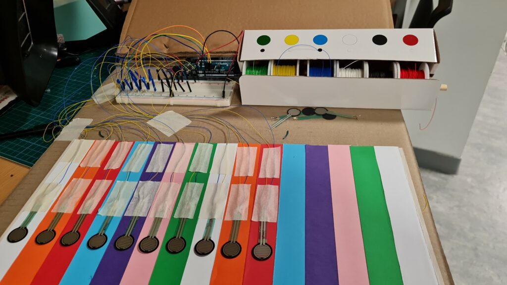As for code, the preload() function helped important audio, including the backing track and the piano key sounds to be prepared before the animation so they could be played on time. Moreover, a very critical challenge I faced was slow sound feedback after a key press. In my attempt to resolve this, I thought of factors that could be the issue, such as animation having a huge load. Using AI recommendation, I tried to reduce the load by increasing lerp(…, …, 0.2) to lerp(…, …, 1) – even if animation would be less smooth. However, this only reduced the feedback delay very slightly – it was still noticeable. I thought more, and realized I could try having Arduino do the checks of the FSR readings over the press threshold and then send the note state to p5(0 or 1) – instead of having p5 do the checks. I tried to revise the code manually at first, but faced disfunctionality, and used AI to help me. After having Arduino do the checks, the feedback delay issue was resolved! Through this experience, I learned how Arduino truly specializes in input/output (at least compared to p5js) really emphasizing the Professor’s words in class.