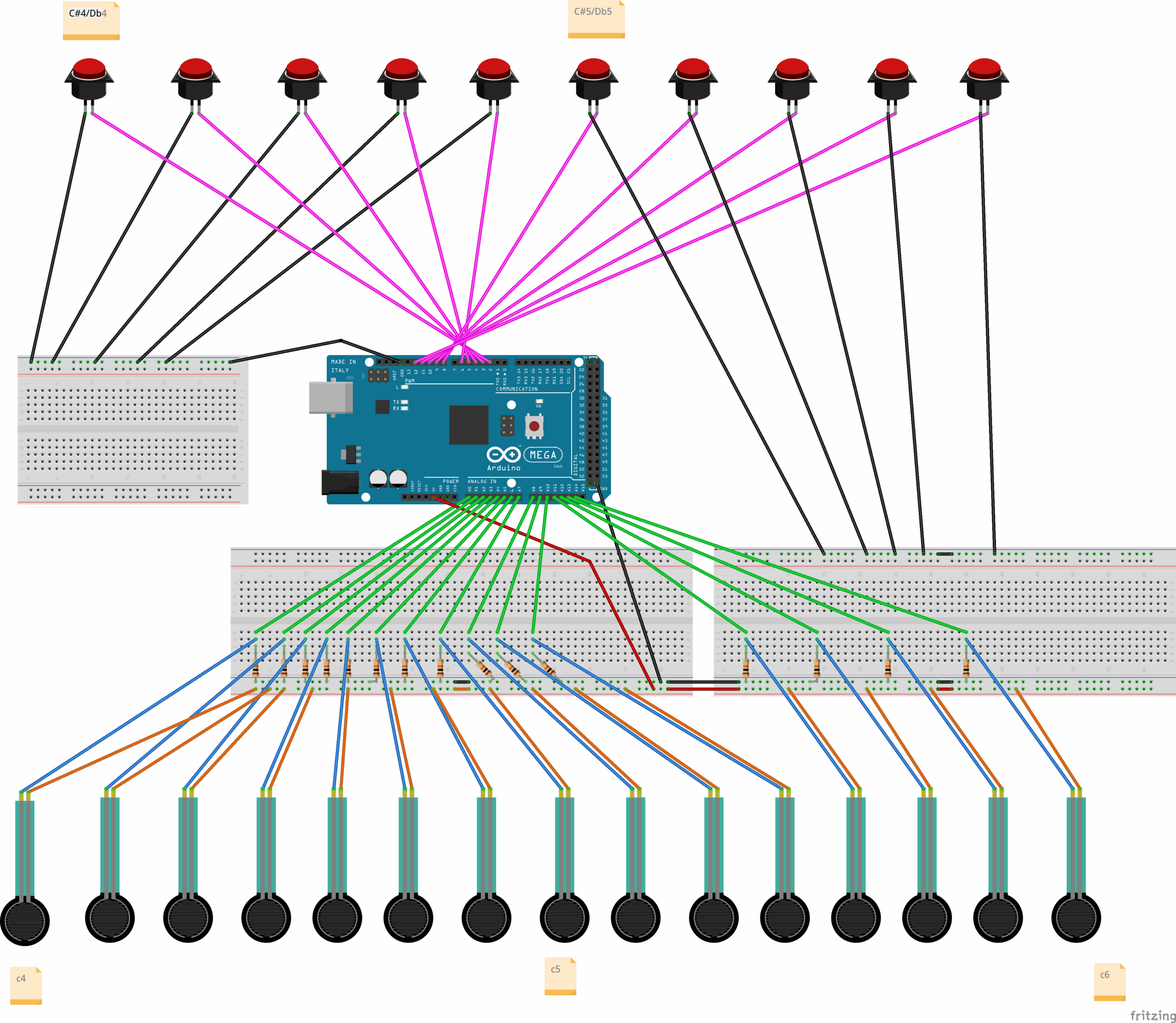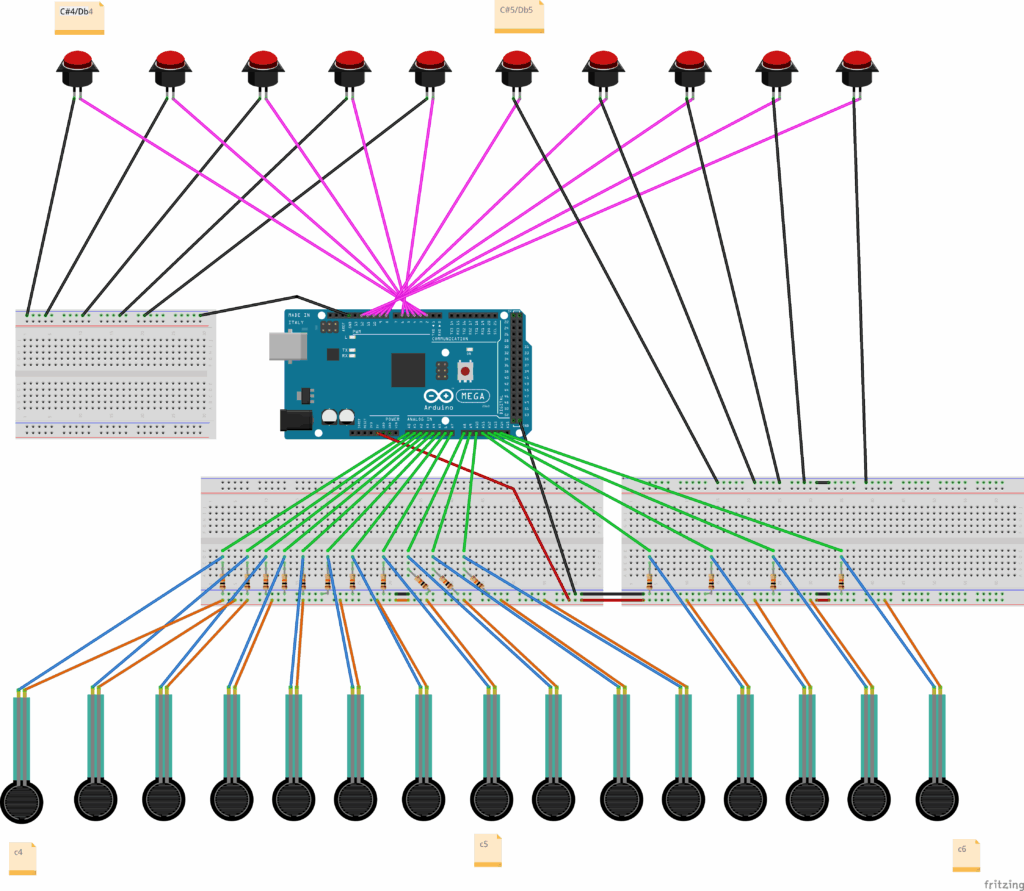 For hardware, I deliberately used an Arduino MEGA for its sufficient provision of analog pins. I used pins A0 to A14 for the force sensitive resistors and pins 2-6 as well as 8-12 for the push buttons. The schematic is attached.
