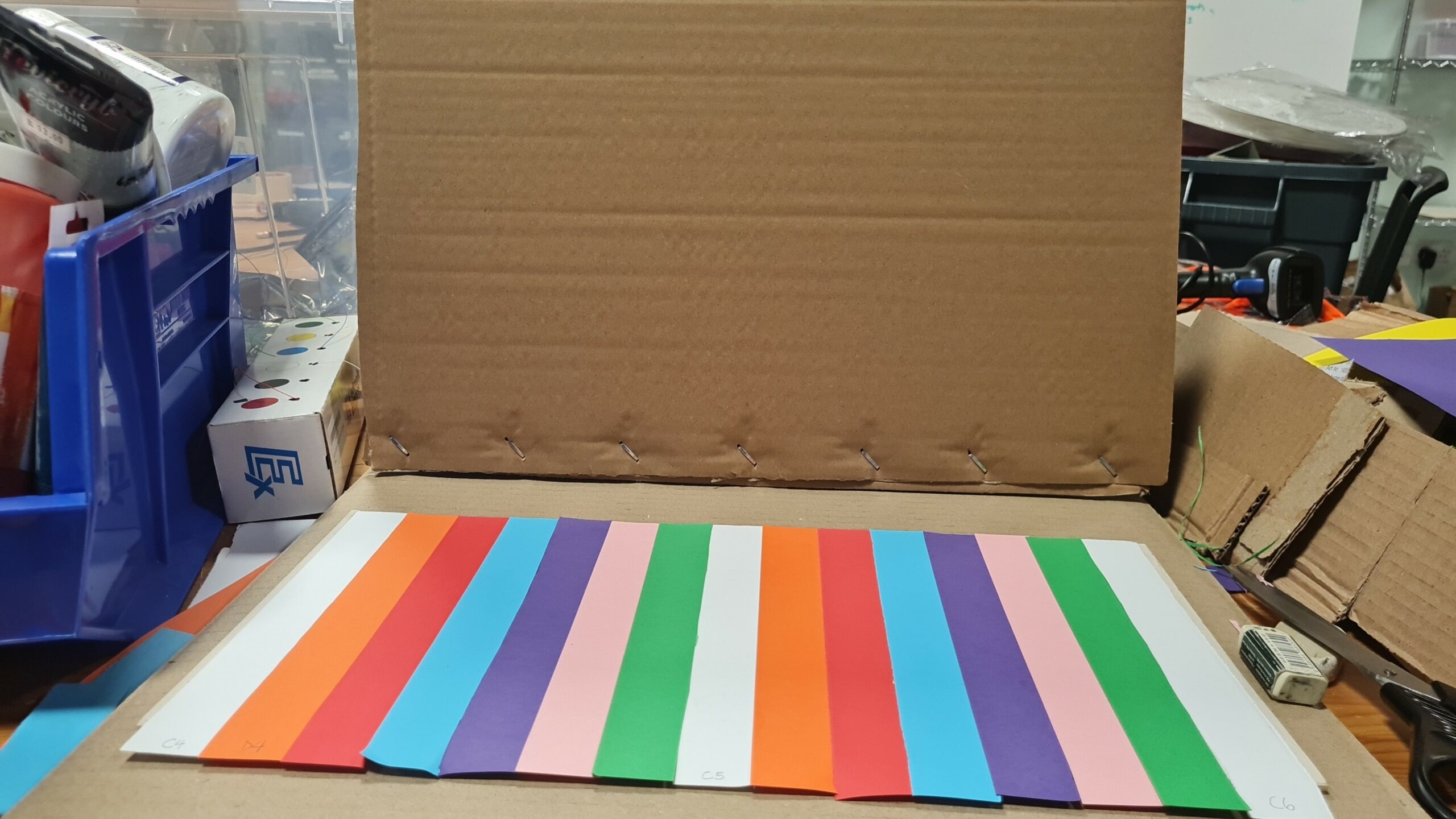 The piano is color-coded by note, so that note “C” is white, “D” is orange, “E” is red, “F” is blue and so on. This was a deliberate choice because seeing different colours on the piano can help users familiarize themselves with the positions of the keys over time. Additionally, I used this presentation slide deck with instructions to play the notes, color-coded, in order (example in Fig. 1). Thus, as users see the color-coded notes on the presentation and try to follow it, they could more quickly and easily match it to the note on the physical piano that they should play.