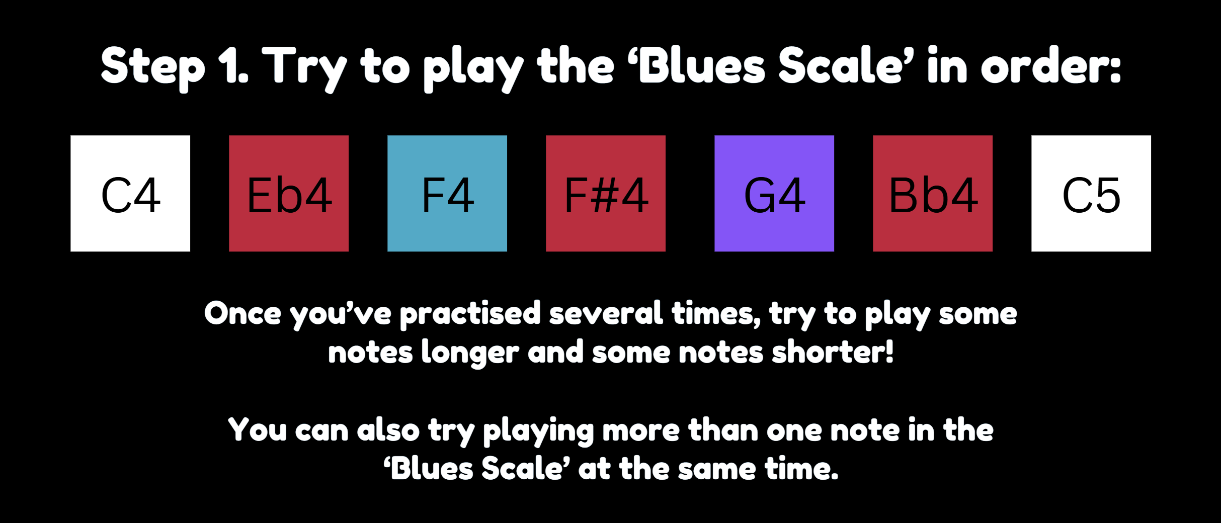 My final project helps users, especially beginners, to learn how to play the piano and learn how to jam to the blues music style. I created a mini-piano consisting of 2 octaves plus one key (spanning notes C4 to C6), which is a welcoming size for beginners. A visualization of a piano is displayed on the p5js sketch, which can be helpful for the piano player to see an animated pressed key and listen to the relevant audio for that pressed key.