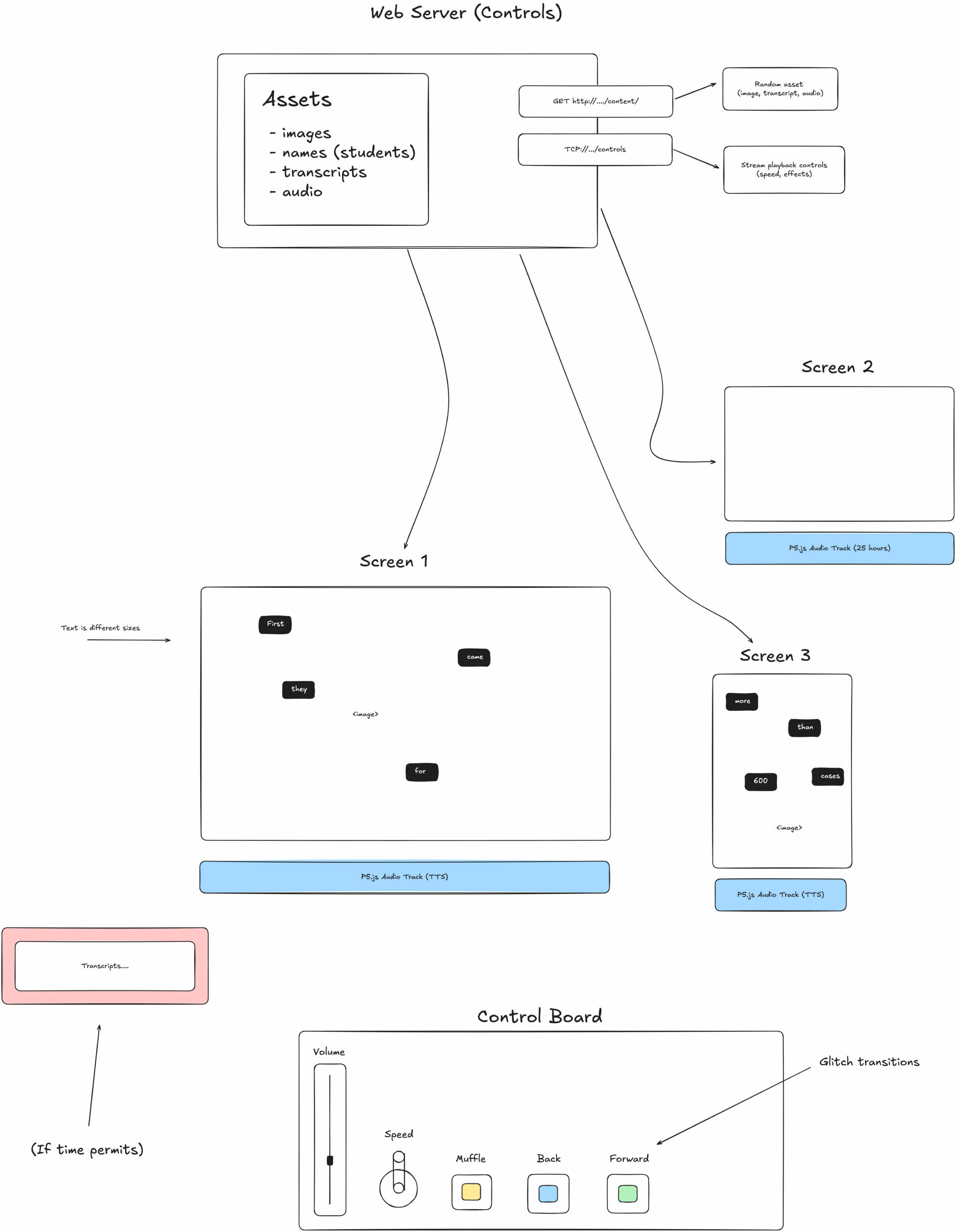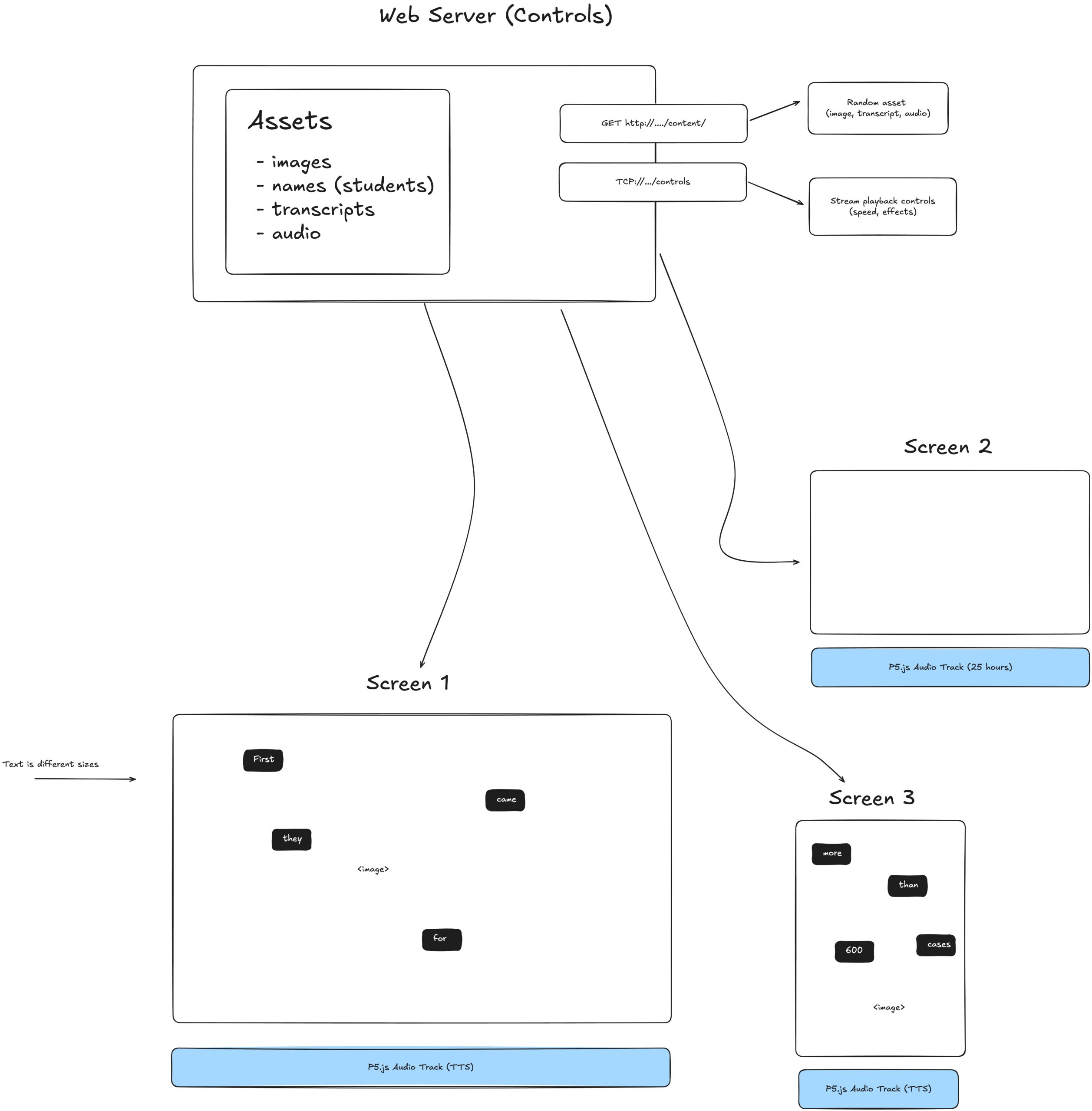 This project is an interactive media piece that combines audio, visuals, and interactive elements to share the personal stories of students who faced repercussions for their politics. Using both digital and physical interfaces, users can explore these narratives at their own pace and in thier own manner.