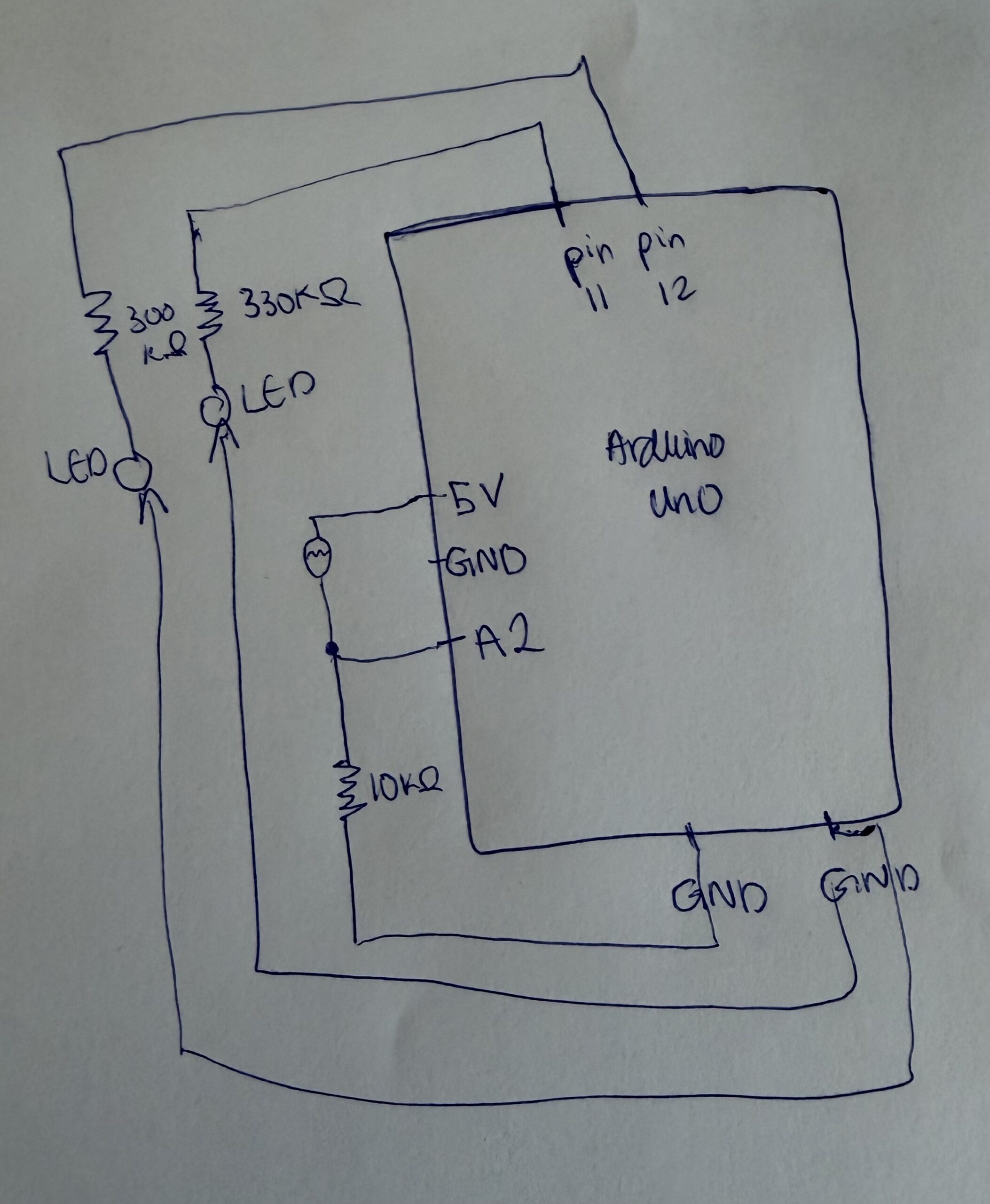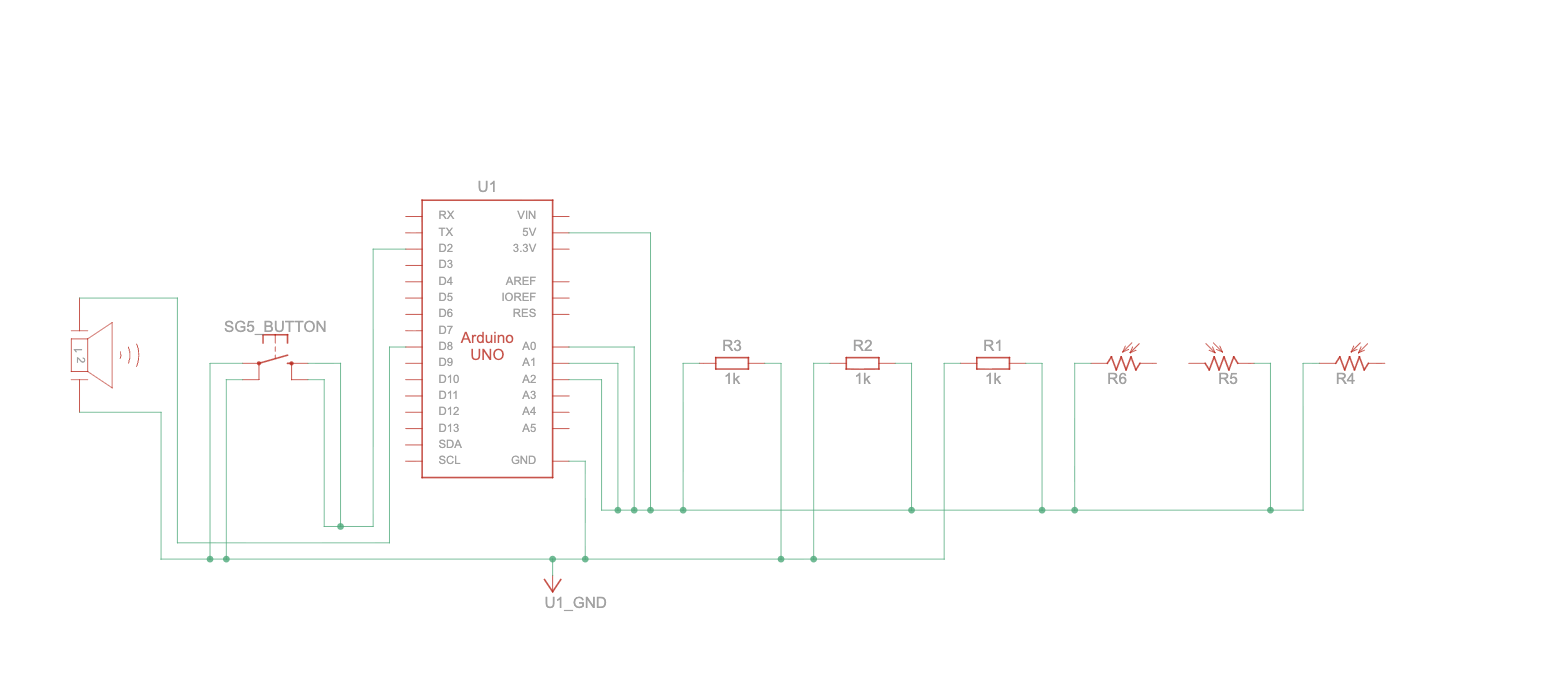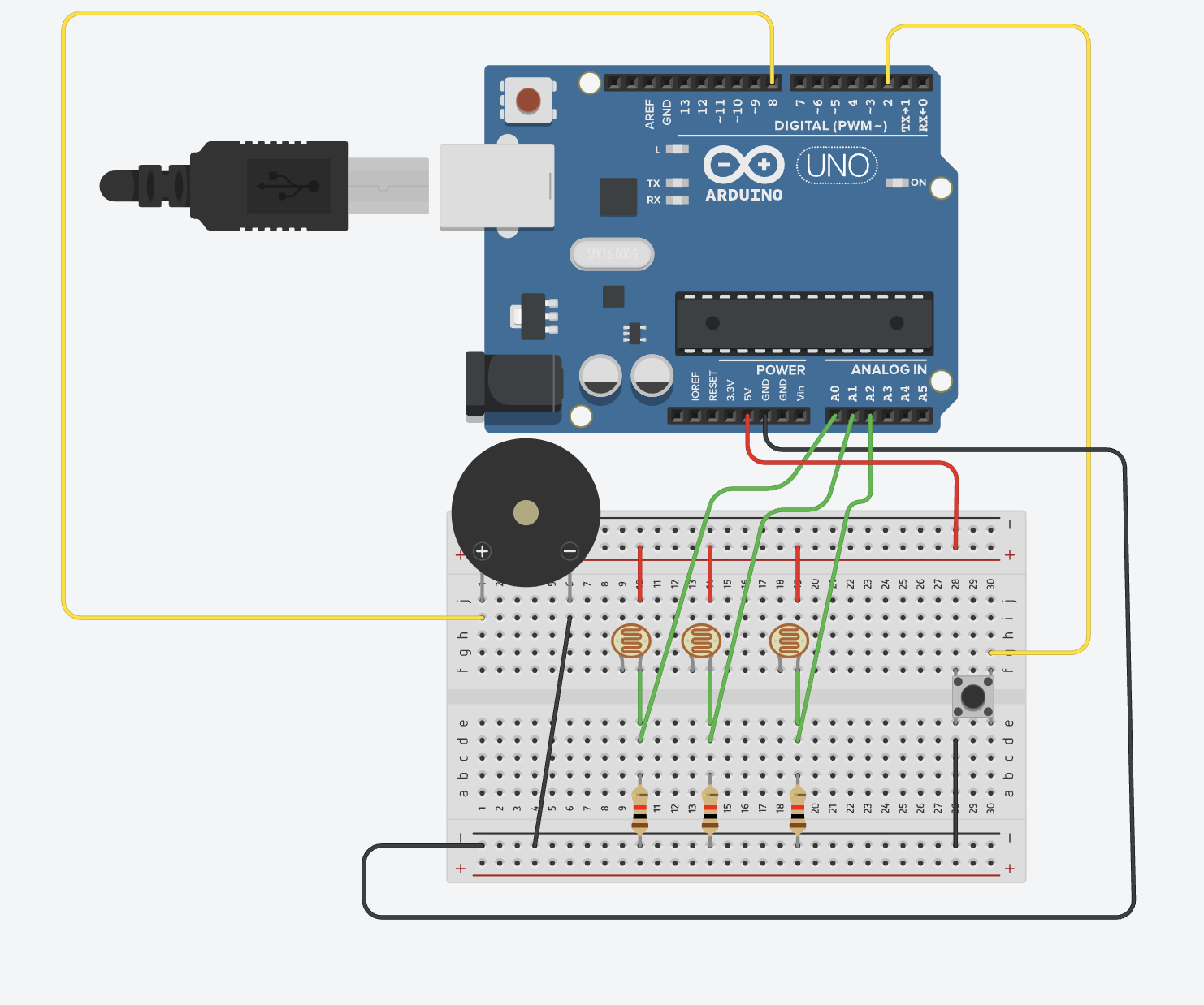 For this week’s project, we used 3 light sensors to play sounds on the piezo speaker, with one note being played constantly when a button is clicked. With the light sensor, once the user’s finger covers the sensor that is when the note is played. Furthermore, we have three sensors each of which plays a different pitch on the piezo speaker. The condition that allows for this is the reading of the sensor in comparison to the threshold we defined. An additional component we added was the button that allows for the sounds to be played on the piezo speaker and then stopped once the button is pressed again.