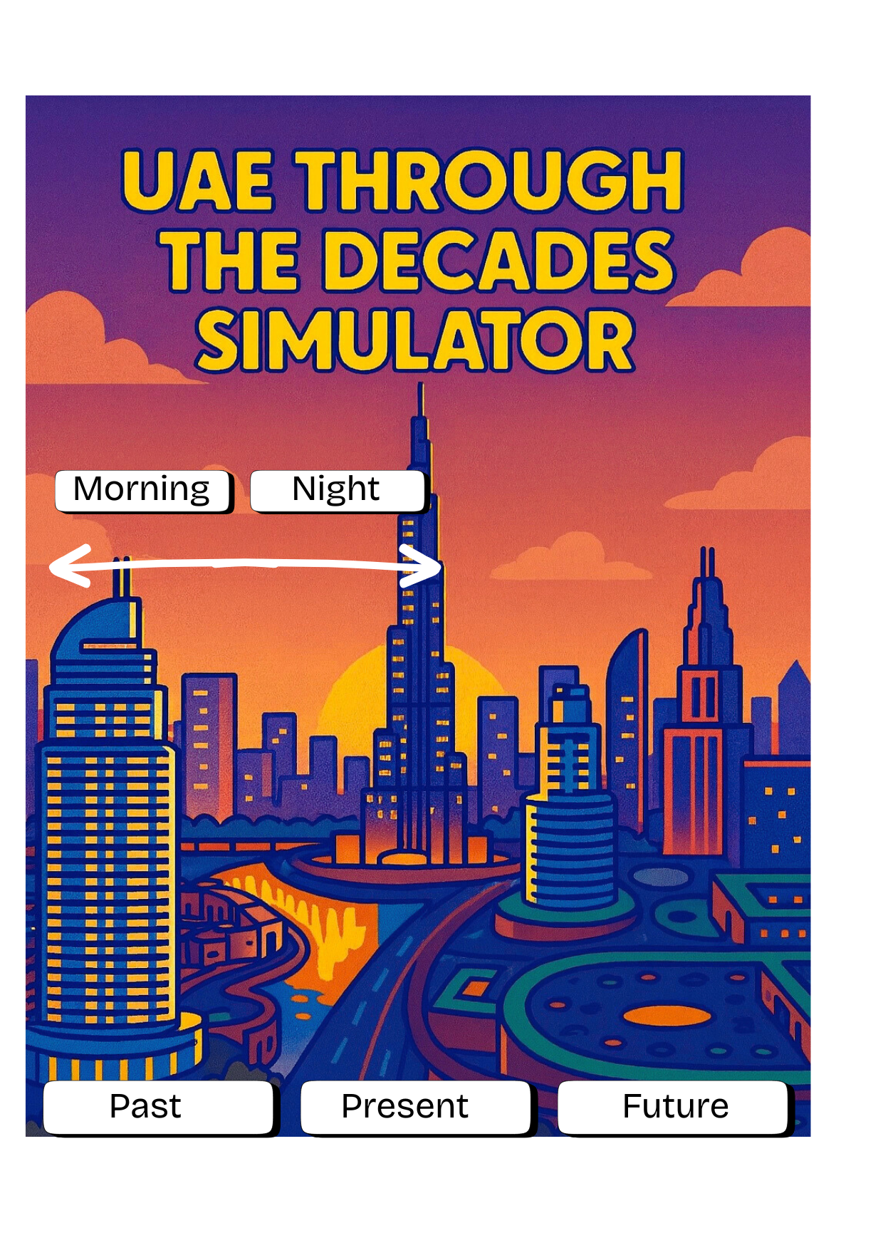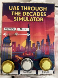 My project is a physical digital simulator that showcases the UAE across three eras: the past, the present, and the imagined future. The idea came from listening to my grandfather’s stories about how he used to live, and how different life is now. Seeing how quickly the UAE developed made me wonder how the future will look. I wanted to create an experience where people can explore this progression visually by interacting with a real physical device.