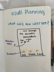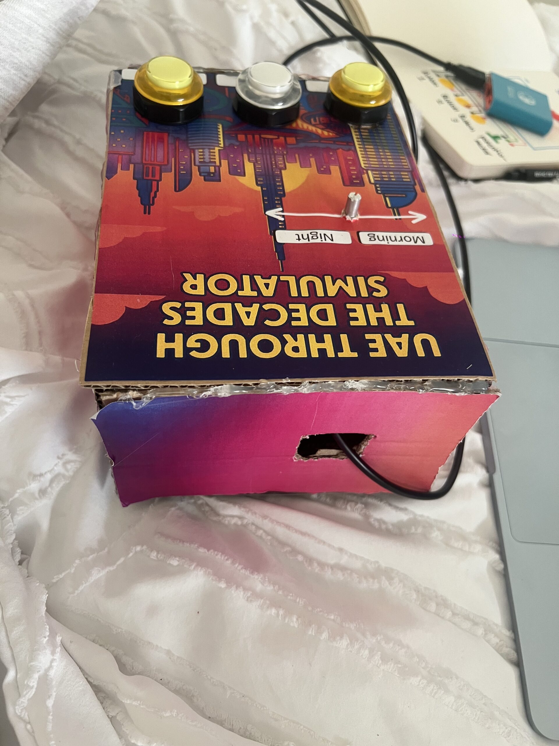 The simulator lets users switch between the three eras using physical buttons, and then cycle through multiple images for each era. A potentiometer controls the transition between morning and night, allowing people to view each scene in two different lighting conditions. Overall, the goal of my concept is to let users “travel through time” and explore how the UAE evolved and how it might continue to evolve.