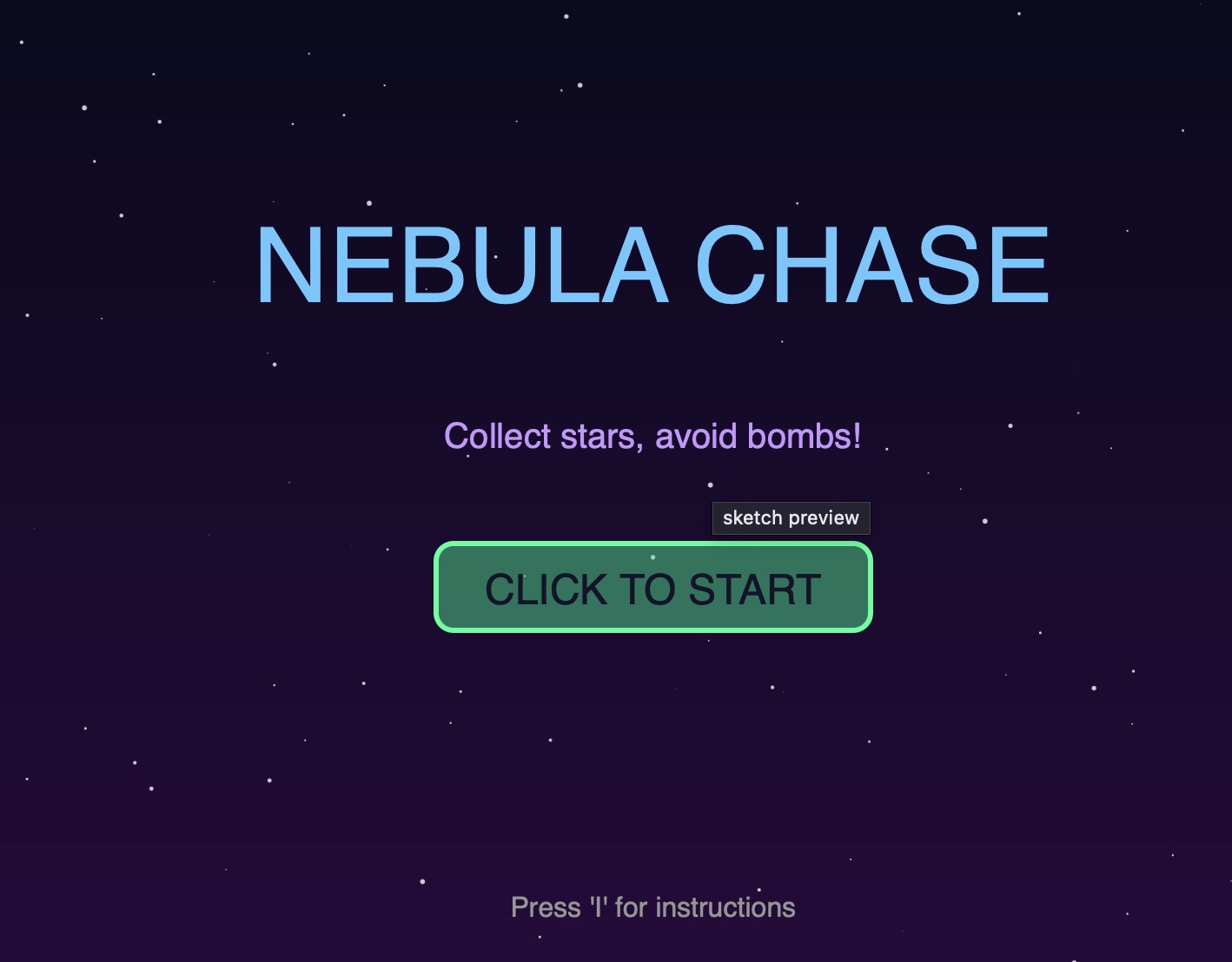 I wanted to make something that felt exciting and had that arcade game tension where you’re always on edge. The idea came from thinking about those old falling-object games, but I wanted to add my own twist, for example, what if the game itself reacted to how much time you have left? What if it got harder as you played? And what if the music changed when things got intense? So Nebula Chase became this space game where you’re flying through a nebula collecting stars while dodging bombs. Simple concept, but I put a lot of work into making it feel engaging.