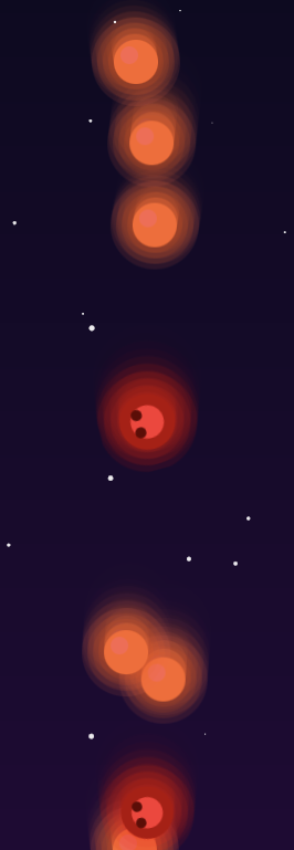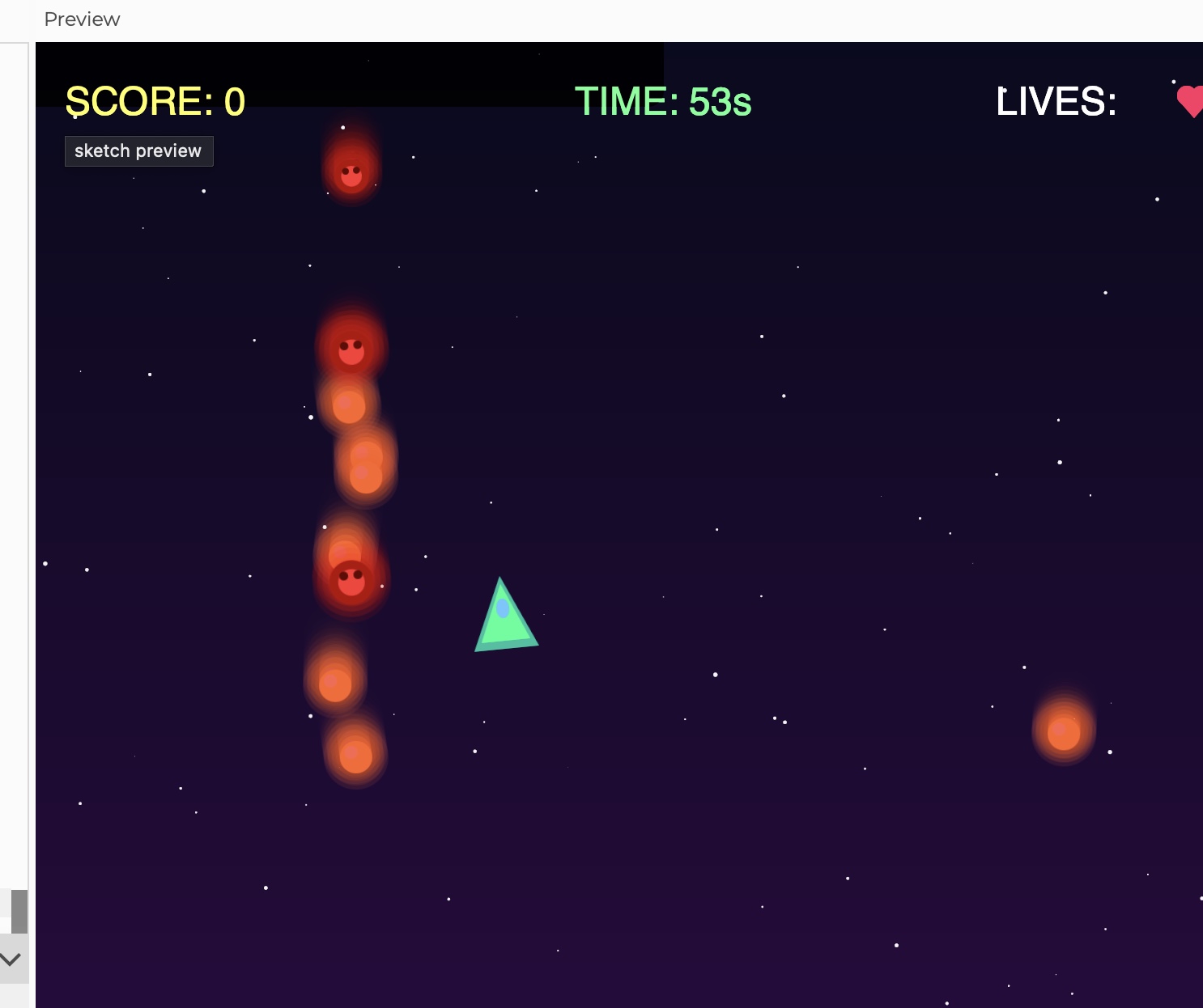 As you can see the stars and bombs have this glowing effects because I drew multiple overlapping circles with decreasing opacity to create that glow. The stars are yellow or white and the bombs are red with a darker center that kind of looks like a skull.