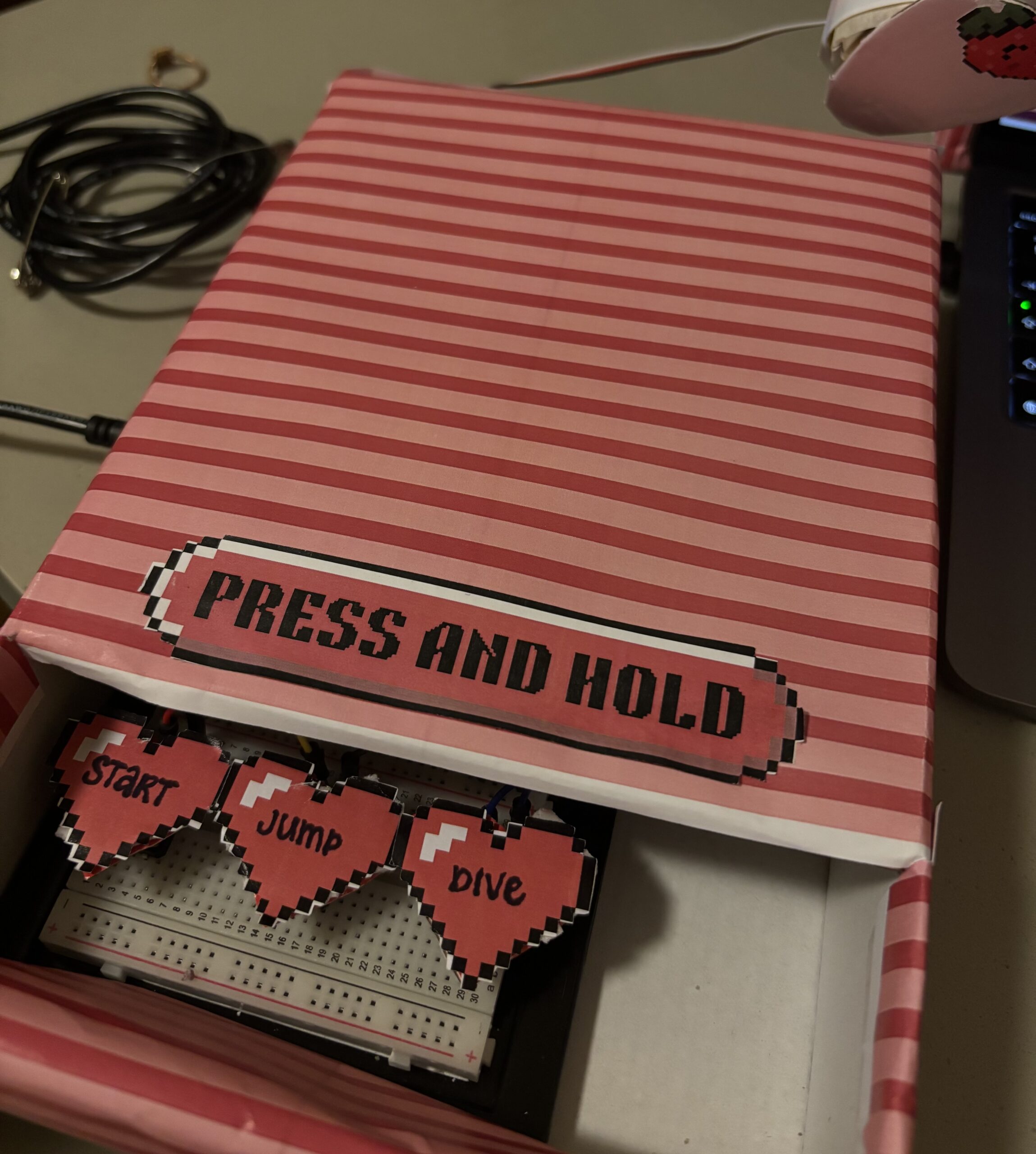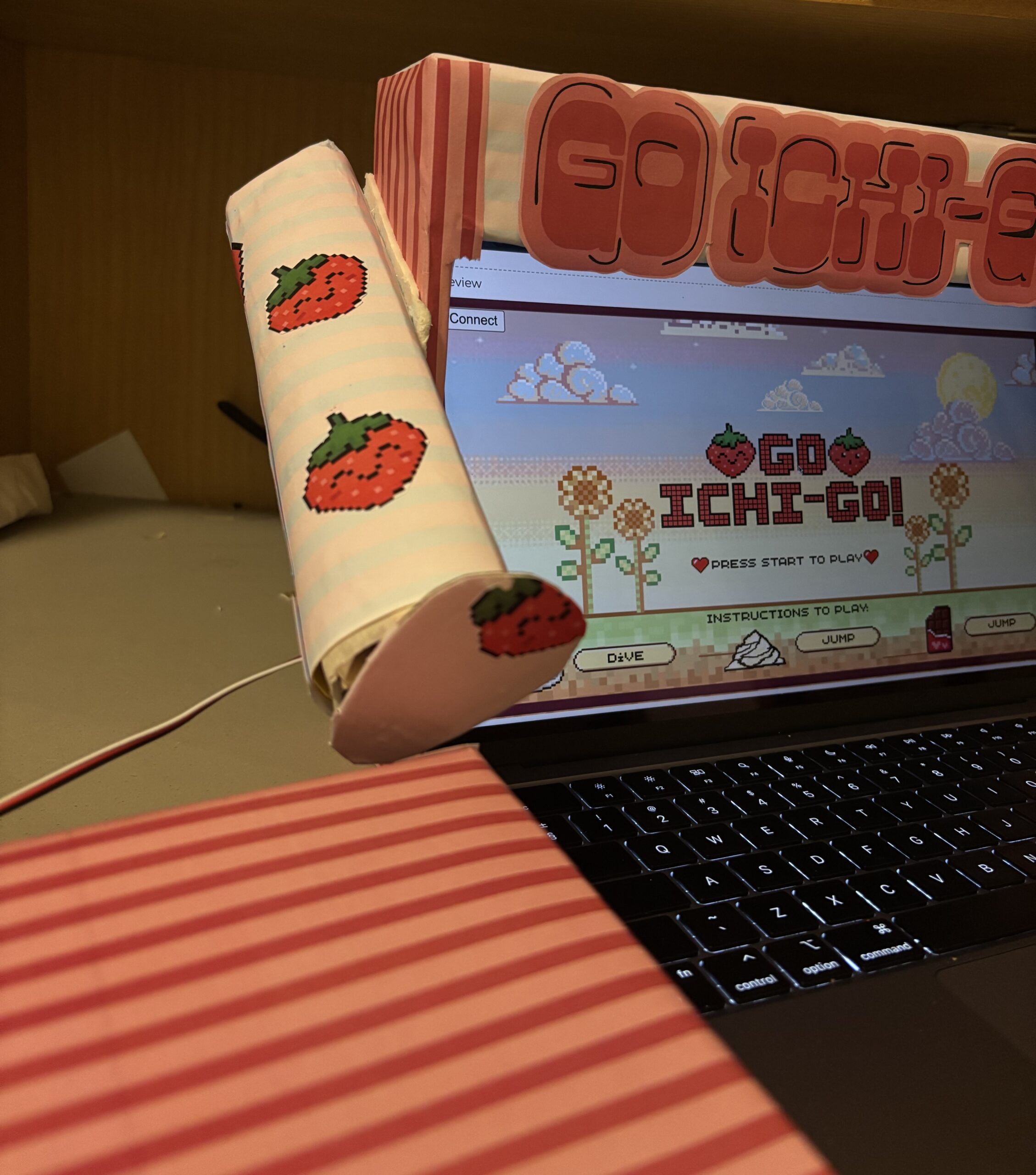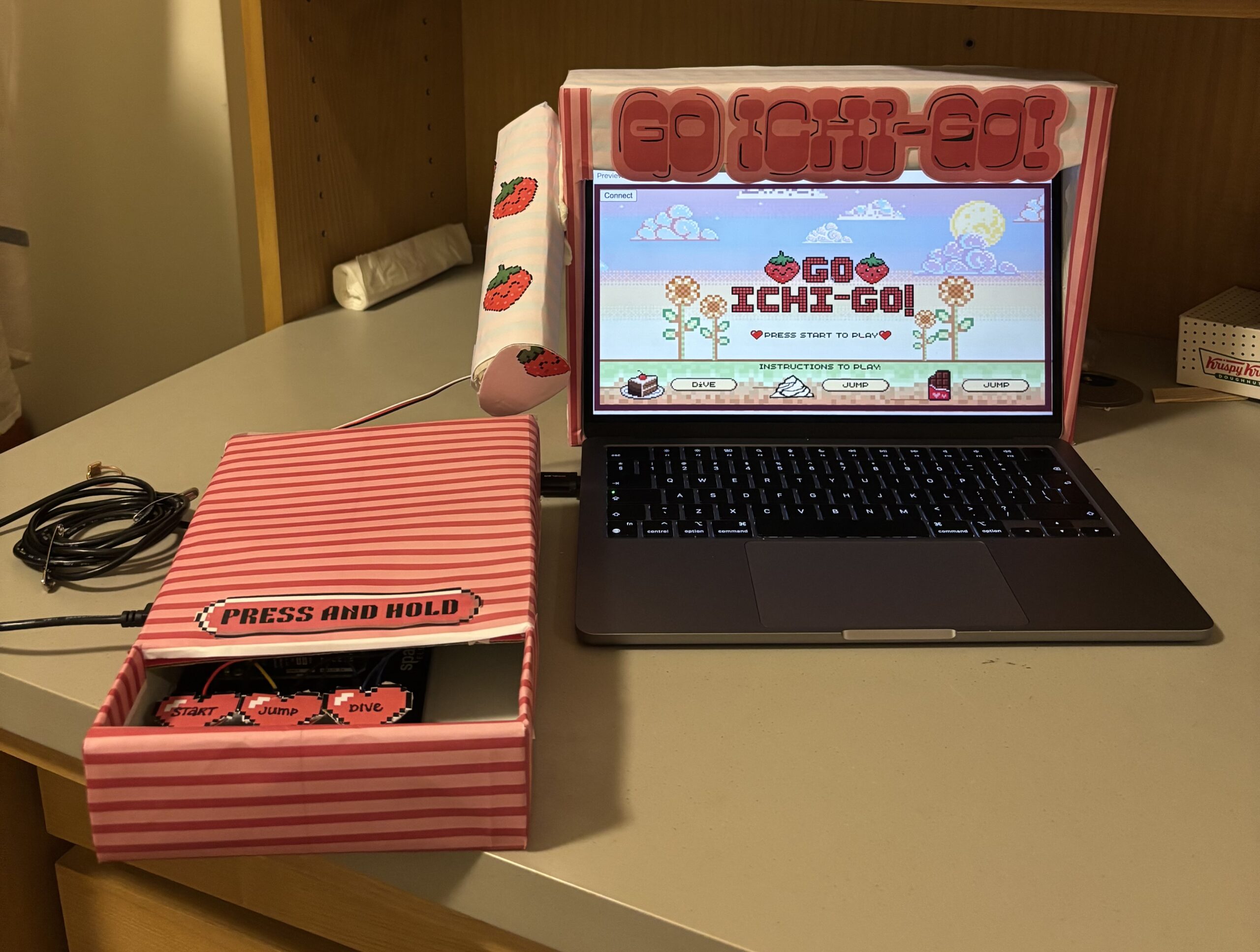 The user is first greeted by a cute, pink kawaii style arcade set-up. A small console board shows three buttons – Start, Jump and Dive. The screen shows a short instruction guide and the title of the game. To start, we click the Start button, which takes us to the main game page. Here, Ichigo has to jump over a puddle of whipped cream or chocolate towers, and dive over floating cake slices. These obstacles are randomised, and after each succesfull pass, a strawberry/sweet themed pun is displayed. With each obstacle, the speed of the game increases, and the obstacles attack Ichigo faster. After the user finishes 10 obstacles, the screen shows a win page with the text to “Enjoy your candy”. Simultaneously, our servo motor candy dispenser turns its knob to shoot out a rain of sweet candy, rewarding the player for winning the game. If the player doesn’t win the game, the game over screen allows them to restart it by pressing the start button again.
