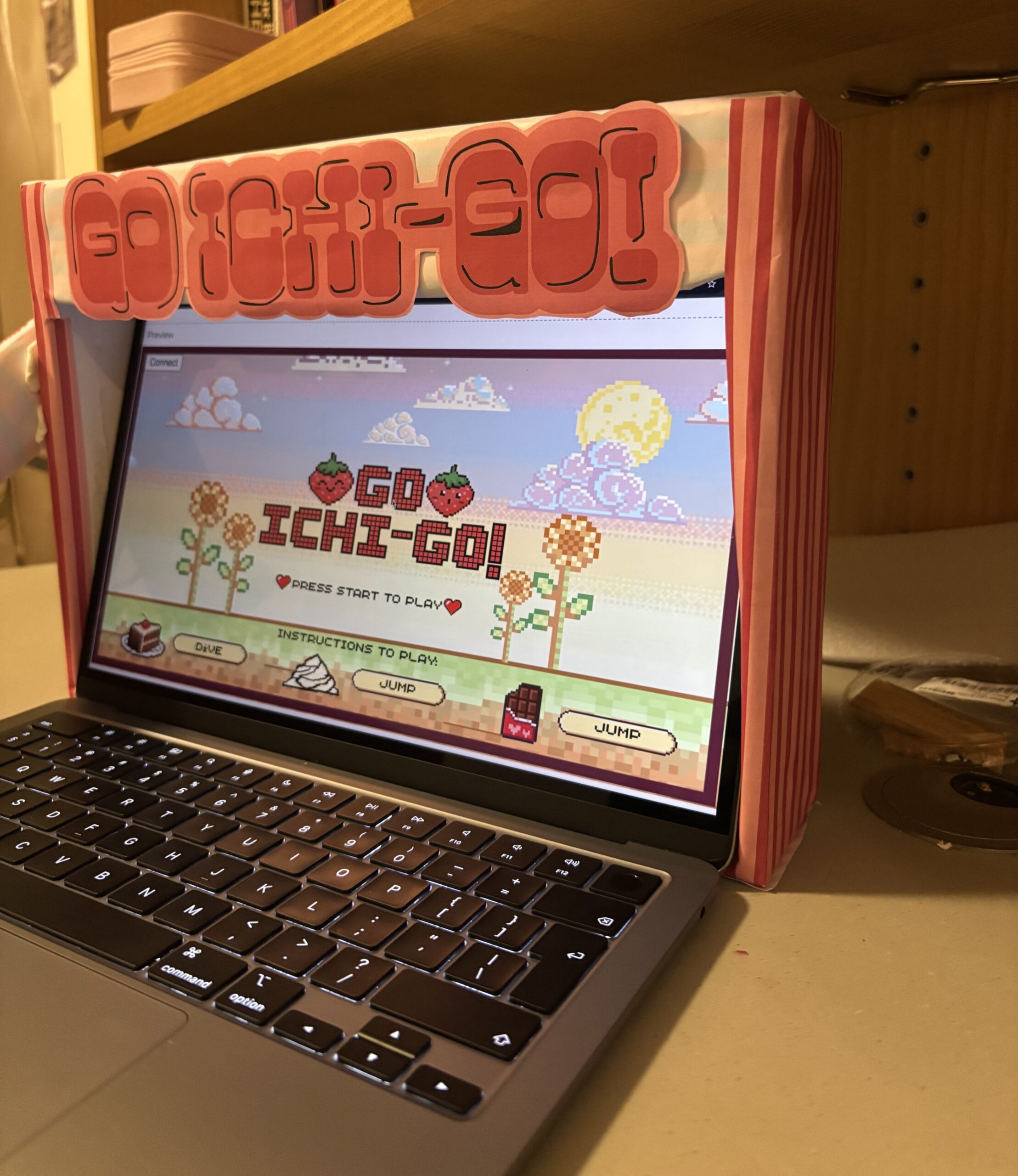 If I could make improvements to my project, I’d definitely try and get the candy dispenser to store more candy and shoot it out into a certain place, rather than the “candy rain” situation (although its super fun to see). I also think I should have made the “PRESS AND HOLD”instruction in the screen and not the box, because there were a few people who didn’t see it at first, and then noticed iut above the buttons. I would also try and use sound effects in the game itself, when Ichigo jumps or dives, like a boing! sound. I would also like to explore adding themes to the game, like Space Ichigo in a different planet, or chef Ichigo with other fruits.