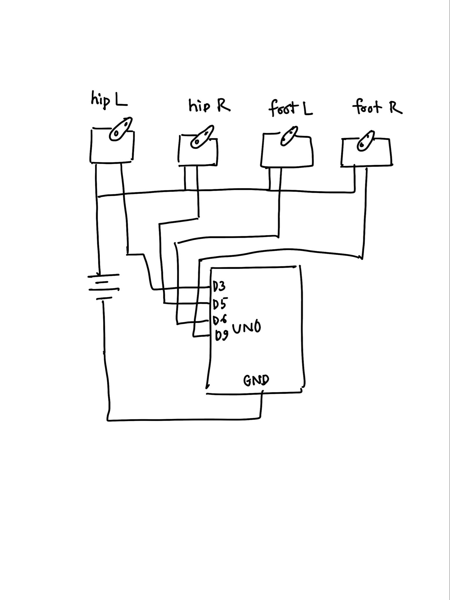 Commands four TowerPro SG90 servos (hipL, hipR, footL, footR) through a custom
