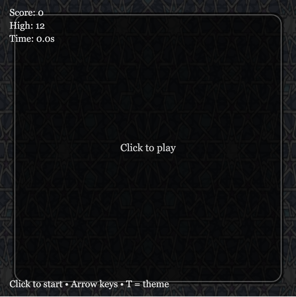 I wanted the experience to feel somewhere between calm and intense. The background slowly shifts between geometric patterns, creating subtle motion without distracting from the game itself. At the same time, the gameplay remains simple and familiar, allowing the user to focus on both playing and experiencing the visuals. Overall, my goal was to take a very well-known game and transform it into something more immersive while still keeping it intuitive.