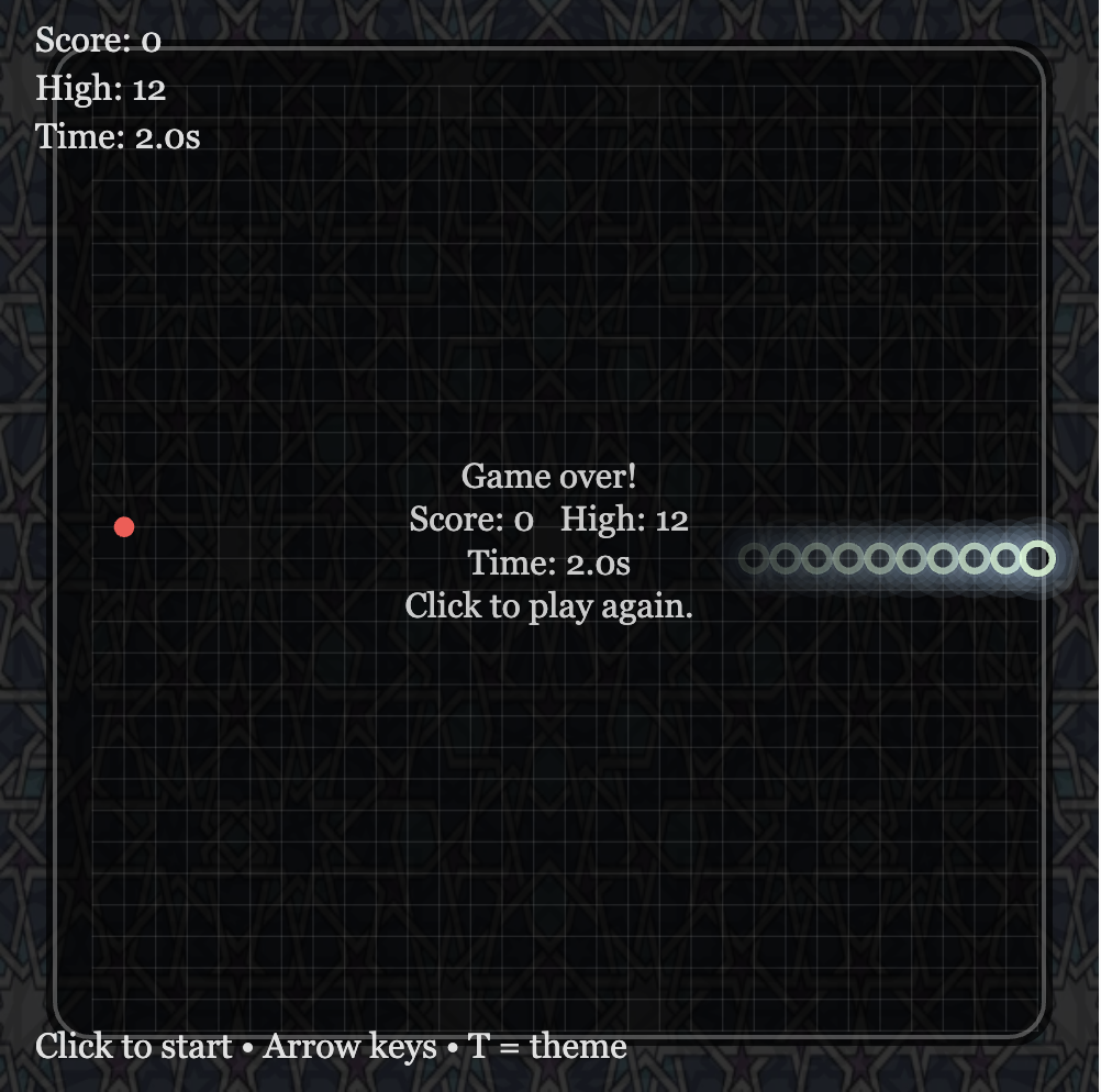 For my project, I redesigned the classic Snake game, with more focus on the atmosphere and visual experience rather than just the gameplay. For the design I added geometric patterns for the background with music playing as well. The game also changes themes by pressing the t button to either light or dark. Instead of the usual blocky snake I made it with a glowing circular shape to represent light movement through an environment.