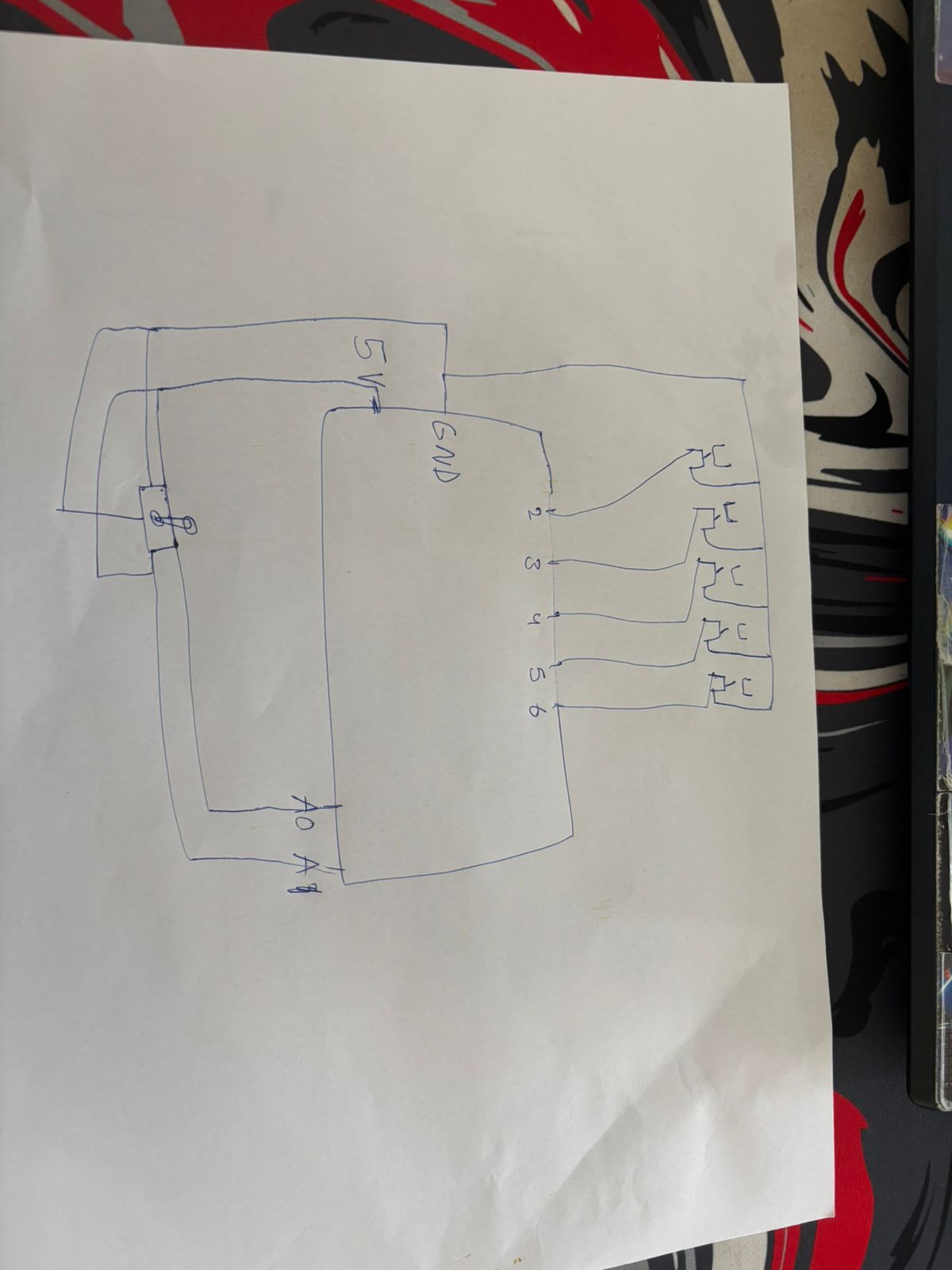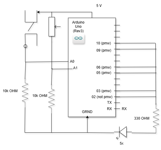 The Arduino controller serves as an alternative input method, allowing users to draw using a joystick and trigger various actions with physical buttons. Five buttons are mapped to specific functions: triggering shape recognition, clearing the canvas, changing drawing color, adjusting stroke thickness, and toggling drawing mode. These correspond to pins 2 through 6 on the Arduino board. Drawing control is achieved through a potentiometer connected to pins A0 and A1, offering analog control of cursor position similar to a joystick. This physical interface provides a more tactile drawing experience that some users may find more intuitive than mouse-based drawing.