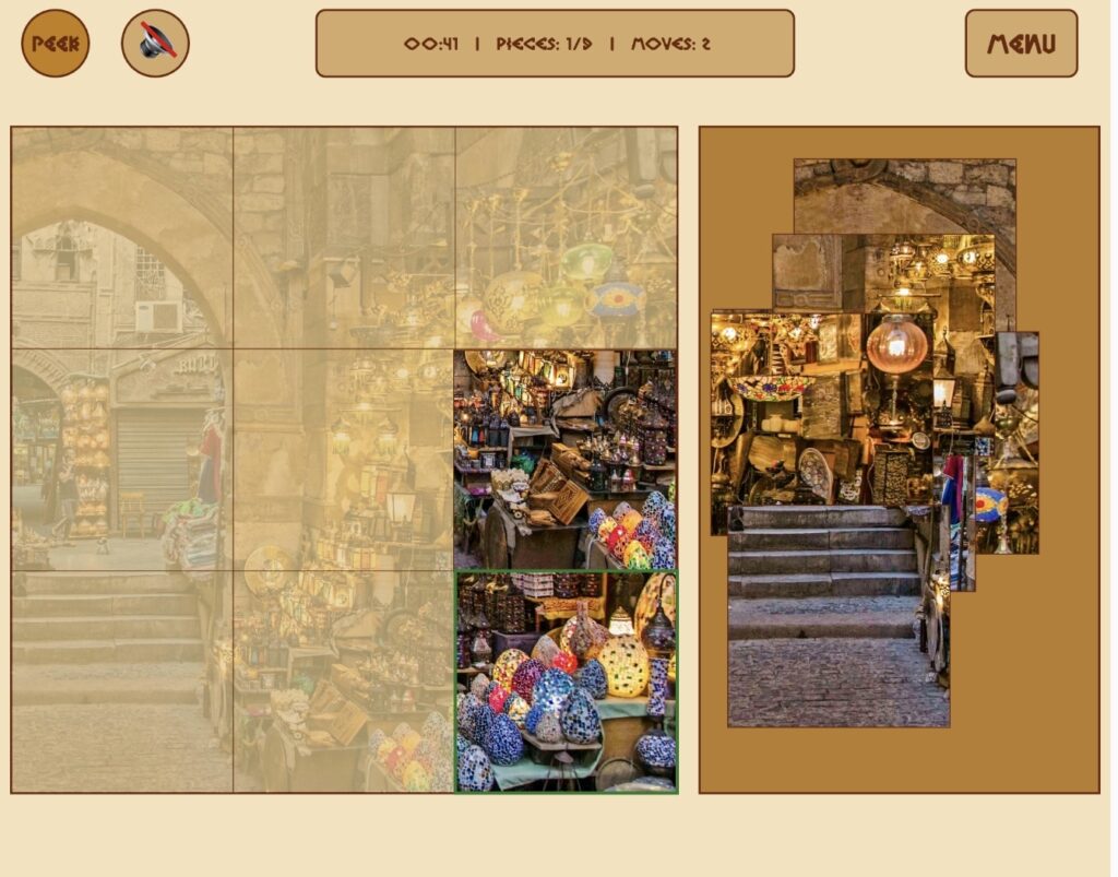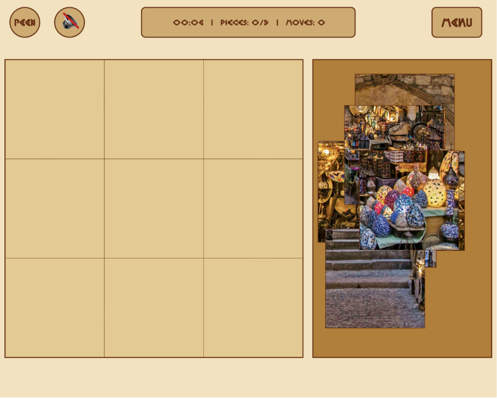 As for the game aspect, I settled on having each piece just be a square, rather than actual puzzle shaped since that would’ve been too difficult to code. The user can move the pieces around using their mouse. I didn’t add any instructions for my game as I felt it was self-explanatory, I tested it with my siblings and they both were able to play the game without any instructions. The only thing that I needed to point out was the ‘peek’ button. The peek button allows the user to see a preview of what the image they’re putting together looks like on the board itself. Initially, I was planning to just have a small reference image at the bottom of the screen, however, the peek overlay option ended up being more helpful and looks more seamless than having something in the corner. While the user plays, there’s background music and a ‘ding’ whenever a piece is placed correctly, if the user turns of the sound, both of these audio elements are muted/stopped. In addition, while the user plays, the game keeps track of the time taken, number of pieces placed, and number of moves taken. Finally, at any point, if the user gives up, they can press the menu button at top right to go back to the main menu. If they do not give up and complete the puzzle successfully, there’s a victory cheer (called a zaghrouta) that plays as well as an ending screen with their time taken. They can press anywhere to restart.