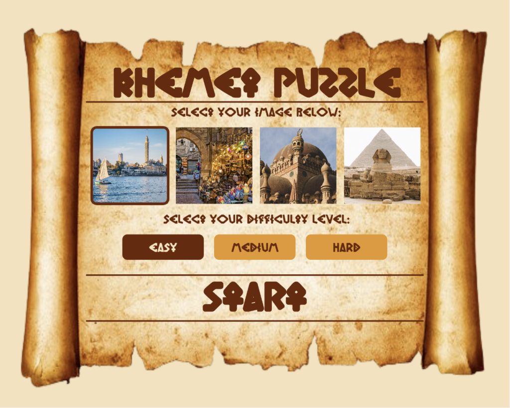 My project is a puzzle solving game with an “Ancient Egypt” theme. I wanted to have theme that related to me and since I’m Egyptian, this theme only made sense. Initially, I planned to use cartoon-like images of landmarks in Egypt, but I couldn’t find any images online of what I wanted or there wasn’t enough variety. I also can’t draw so I ended up just using realistic images instead (which I think I found through a website called freepik, but it was so long ago that I don’t even remember anymore). I had a rough plan of how I wanted the different screens within the game to look like in Canva (included in my midterm progress documentation), most things stayed the same in my final project. I found a font online called “khamenet,” which I decided to use throughout. I feel that this really added to the vibe of my project.