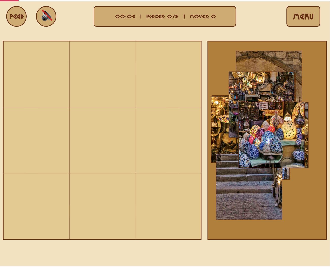 On the game screen, there’s a puzzle board on the left where the user puts the pieces together, a piece tray on the right where all the pieces start out scattered, and a few buttons at the top to control different things. First, top left, there’s the peek button. This button (as described earlier) allows the users to see a light preview of the full image overlaid on the puzzle board. I’m really proud of this element since I didn’t really have a plan of how I wanted to display the preview, so the fact that in the end, it ended up being something so simple is really nice.
