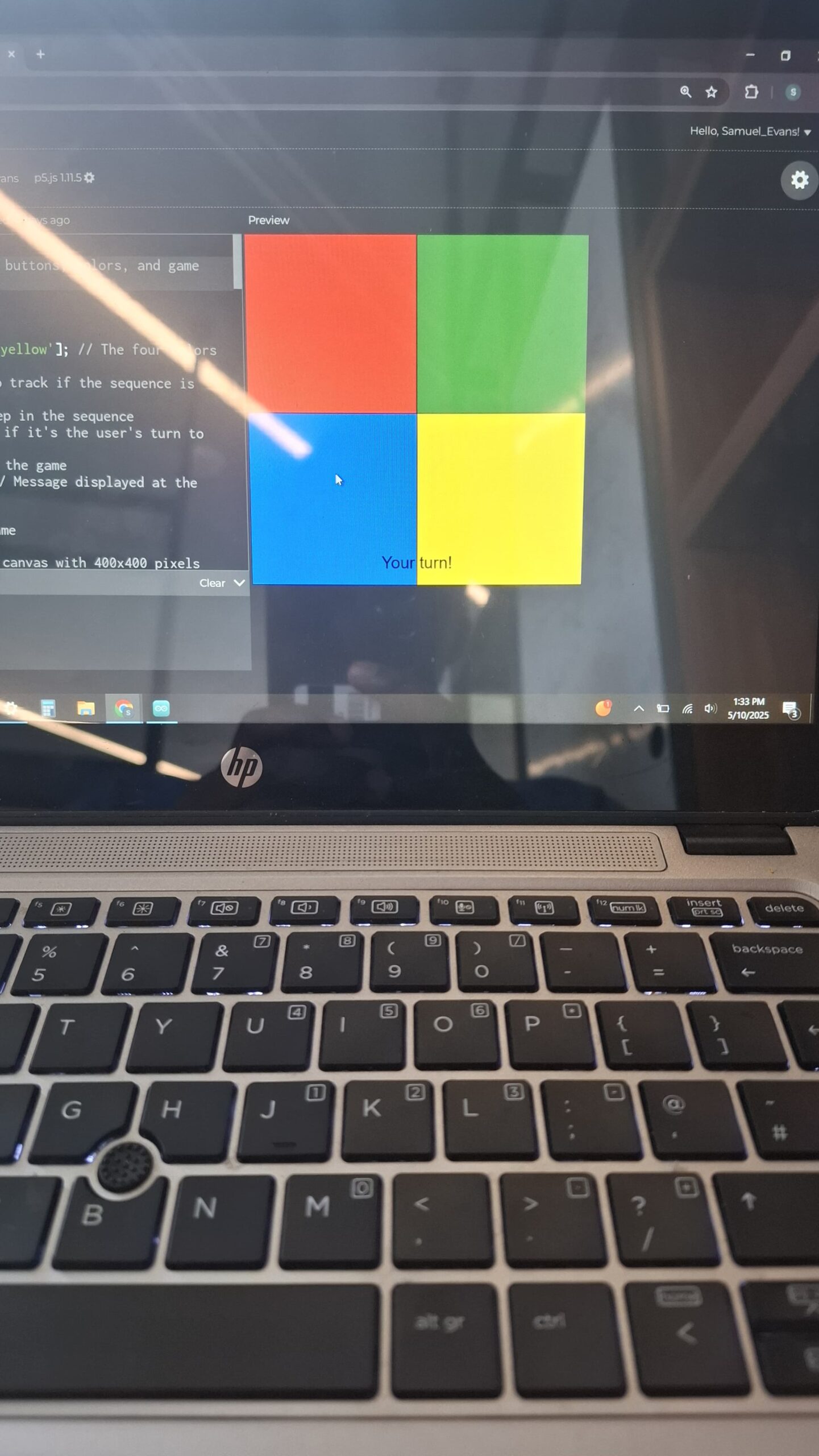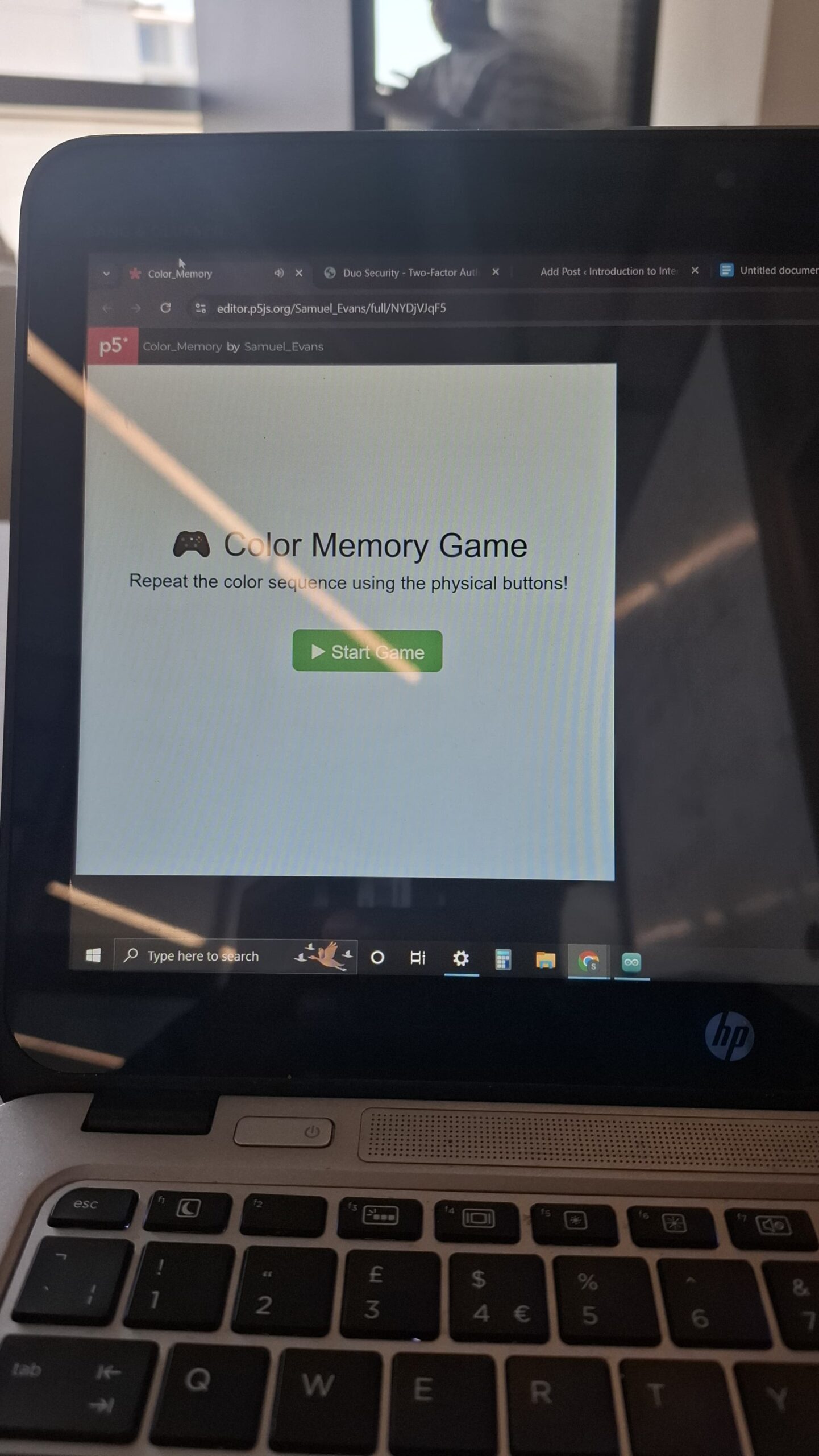 For my p5js I mainly used functions to help with handling of data and processing from the arduino and to display. In the sketch I had html, a webserial library, music(background, correct and incorrect sounds), and the actual p5js sketch code. Some of the notable portions of the p5js code include music handling, serial communication, game start page, button handling and game over page.